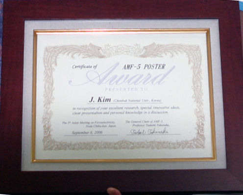 자연과학대학 물리학과 부상돈 교수와 대학원생 김종옥, 최용찬 학생이 지난 9월 3일부터 7일까지 동경이과대학에서 열린 '제5회 아시아 강유전체 학회(Asian Meeting on Ferroelectrics, AMF)'에서 최고의 포스터 발표상인 "Poster Award"을 획득하였다.