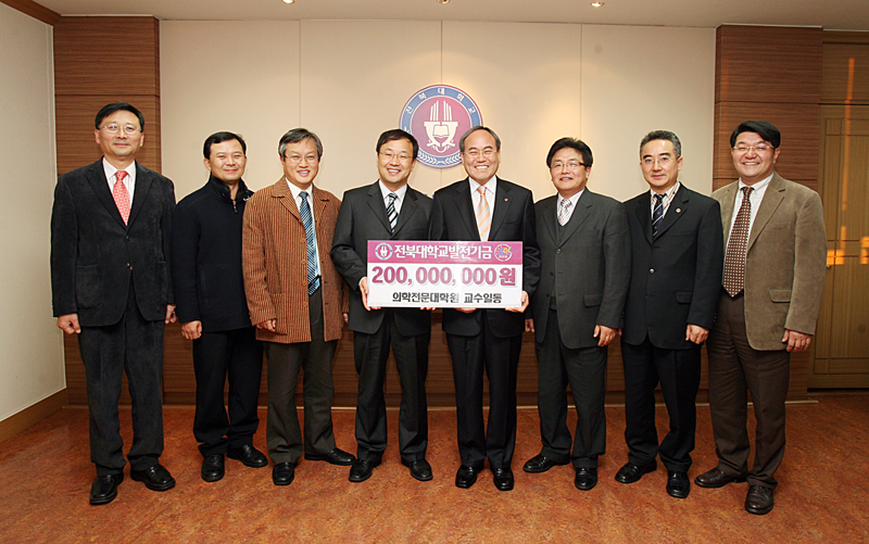 우리 대학 의학전문대학원 교수 일동이 11월 21일 오후 5시 서거석 총장을 찾아 발전기금 2억원을 쾌척했다.