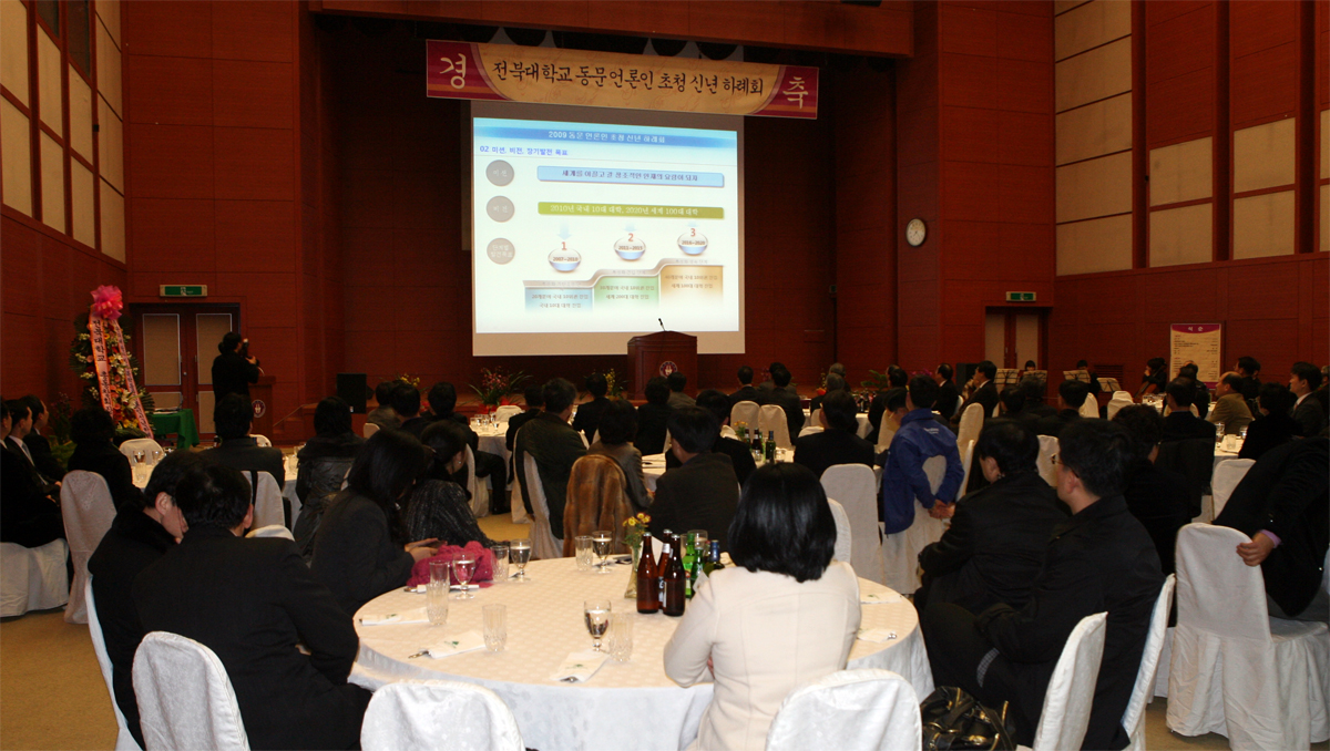이날 신년 하례회에는 우리 대학 서거석 총장을 비롯한 보직 교수들과 신효균 동문 언론인회장(행정학 75학번, JTV 방송본부장) 등 도내 신문사와 방송사, 통신사에 종사하는 동문 언론인 100여명이 참석해 성황을 이뤘다.
