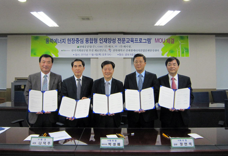 신재생에너지산업인재양성센터가 최근 한국기계연구원 부설 재료연구소(KIMS)·현대중공업(주)·(주)데크·(주)케이엠 등과 협약을 체결하고 풍력에너지 현장중심 융합형 인재양성 전문교육프로그램 운영에 나선다.