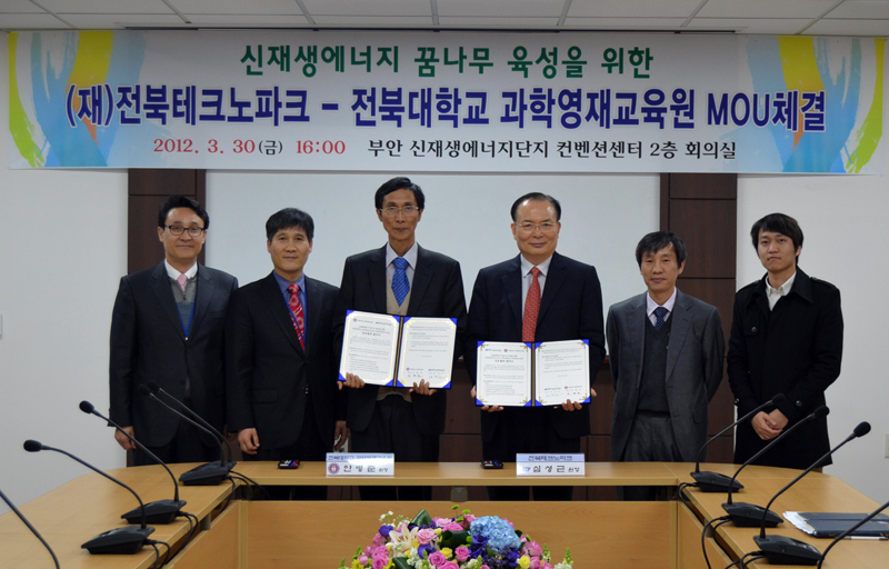과학영재교육원이 최근 부안 신재생에너지단지에서 전북테크노파크와 신재생에너지 분야 꿈나무 육성과 상호 원활한 정보 교육 및 업무 지원을 위한 협약을 체결했기 때문이다.