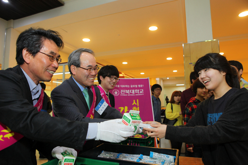 서거석 총장과 신효근 부총장, 안행근 학생처장을 비롯한 본부 보직자, 도서관장, 총학생회 학생 등은 4월 26일 오후 8시 30분 학습도서관과 중앙도서관, 익산캠퍼스 등에서 중간고사 기간 책과 씨름하는 학생 1천여 명에게 김밥과 우유를 나누며 격려하는 시간을 가졌다.