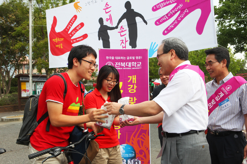 새 학기를 맞아 9월 4일 오전 8시, 우리대학 서거석 총장을 비롯한 보직자들이 등교하는 학생들에게 떡과 음료를 나누며 환영 행사를 가졌다.