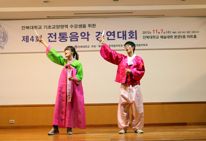 이 대회는 우리대학이 지역색을 살려 2008년 전국 최초로 설강한 교양필수과목인 ‘전통음악’ 수강생들이 지난 한 학기동안 배운 ‘판소리’와 ‘단소 실기’를 뽐내는 자리로 전북대만의 독특한 ‘책걸이’를 겸한 대회인 셈이다.
