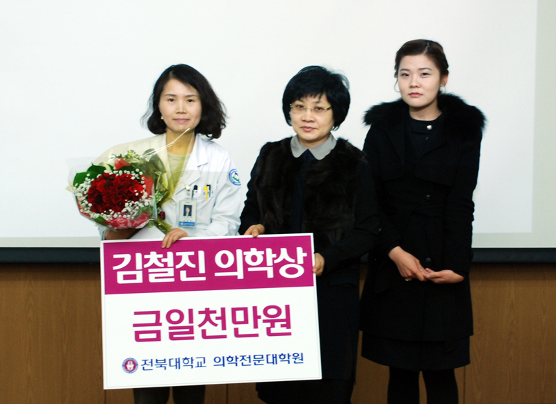 ‘김철진 의학상’은 지난 2011년 지병으로 영면한 故김철진 교수 유족들이 의전원 학생들의 면학 분위기 향상과 동료 교수들의 연구 진흥을 바라는 고인의 유지를 받들어 3억 원의 기금을 기탁해 제정된 상.