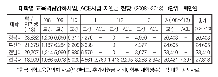 우리대학은 지난 2011년 정부가 국내에서 가장 잘 가르치는 대학을 뽑아 다양하고 특색 있는 학부교육의 선도 모델을 창출하기 위한 ACE 사업에 선정됐고, 교육역량강화사업에도 지역 거점 국립대 중 유일하게 6년 연속 이름을 올렸다.