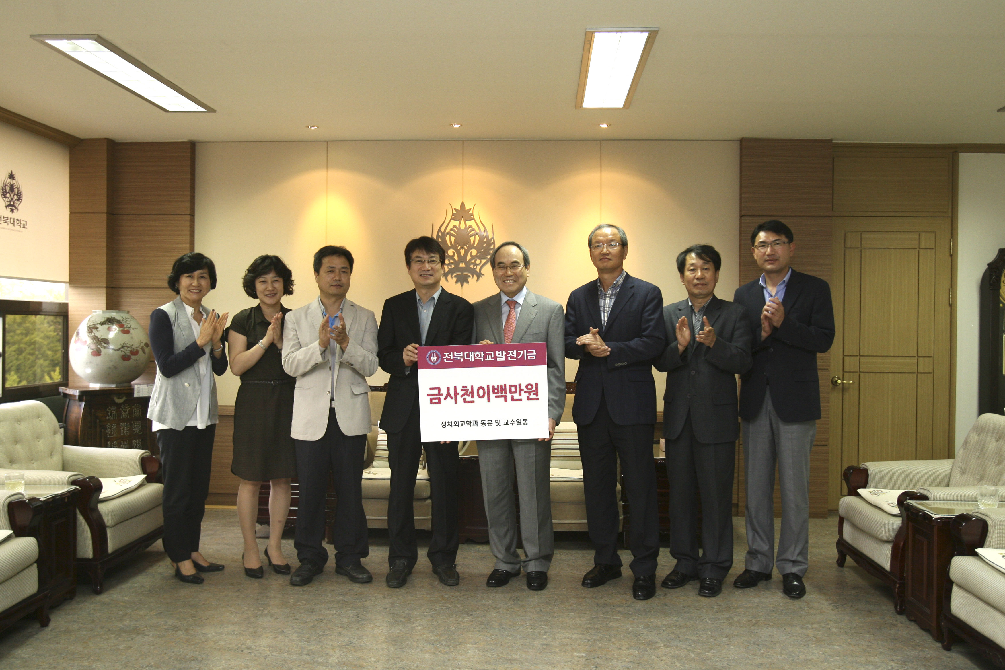 9월 2일 본부 총장실에서 열린 발전기금 기탁식에는 사회대 김창희 학장과 전제성 학과장을 비롯한 정치외교학과 교수들이 참석해 대학과 학과 발전을 위한 교수 및 동문들이 소중한 마음을 전했다.