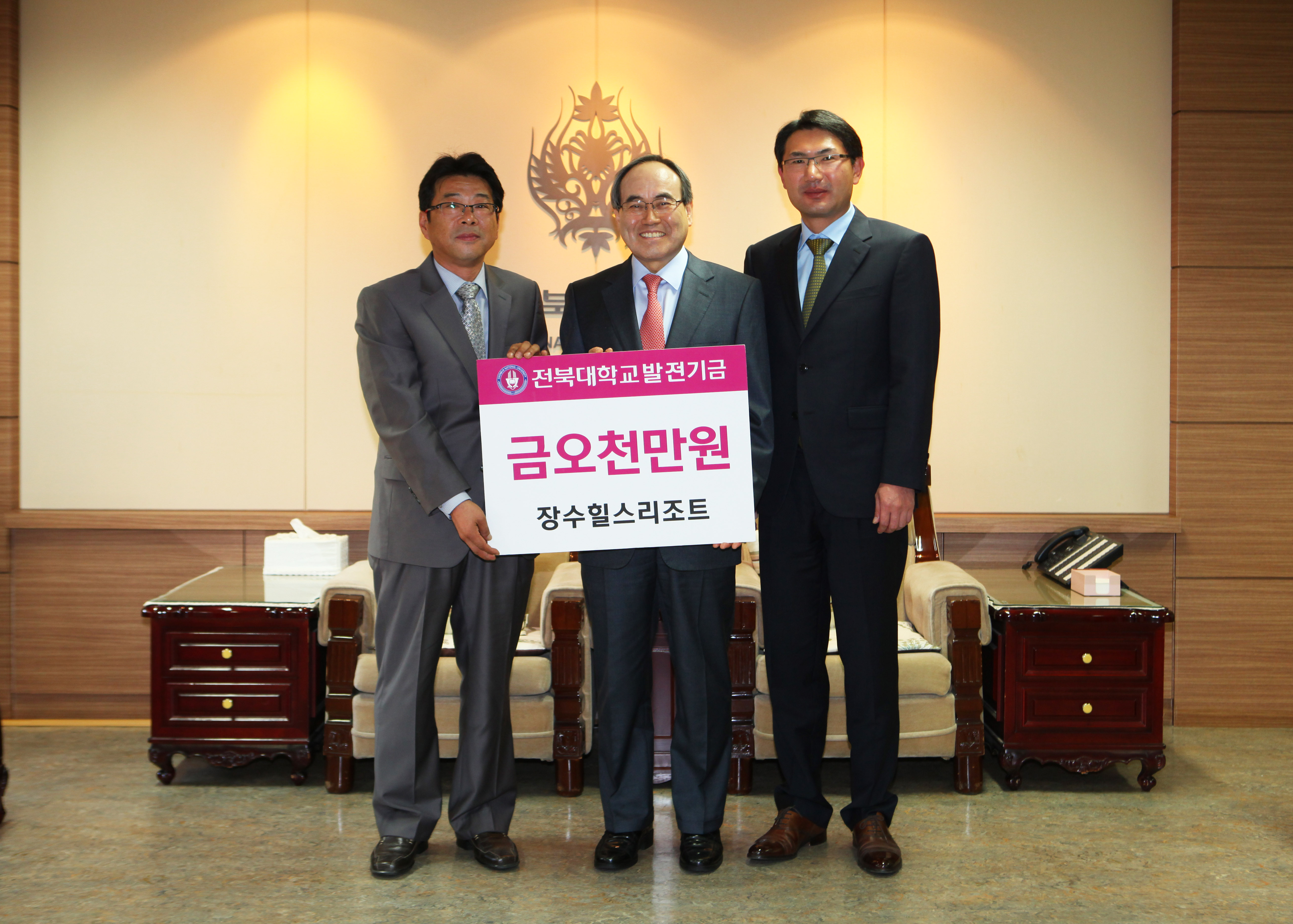장수 힐스리조트 이기언 본부장은 10월 14일 오후 5시 우리대학을 찾아 서거석 총장을 접견하고 발전기금 기탁식을 가졌다.