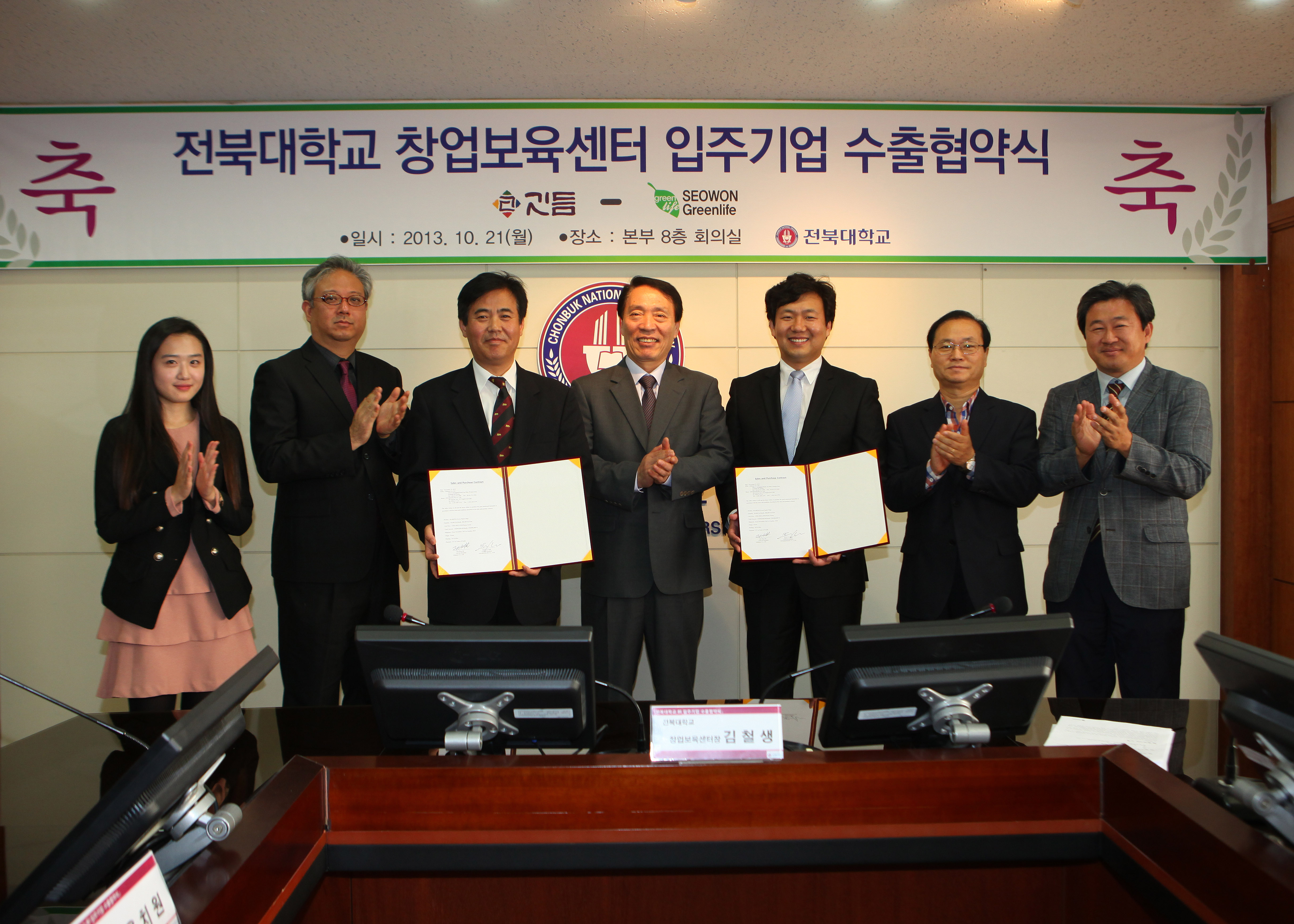 이를 위해 (유)깃듬과 서원 그린라이프는 21일 전북대 본부 8층 회의실에서 옥치원 (유)깃듬 대표이사와 박영관 서원 그린라이프 대표이사, 전북대 김철생 창업보육센터장, 권대규 기술사업화센터장 등이 참석한 가운데 50만 불 수출에 합의하는 협약을 체결했다.