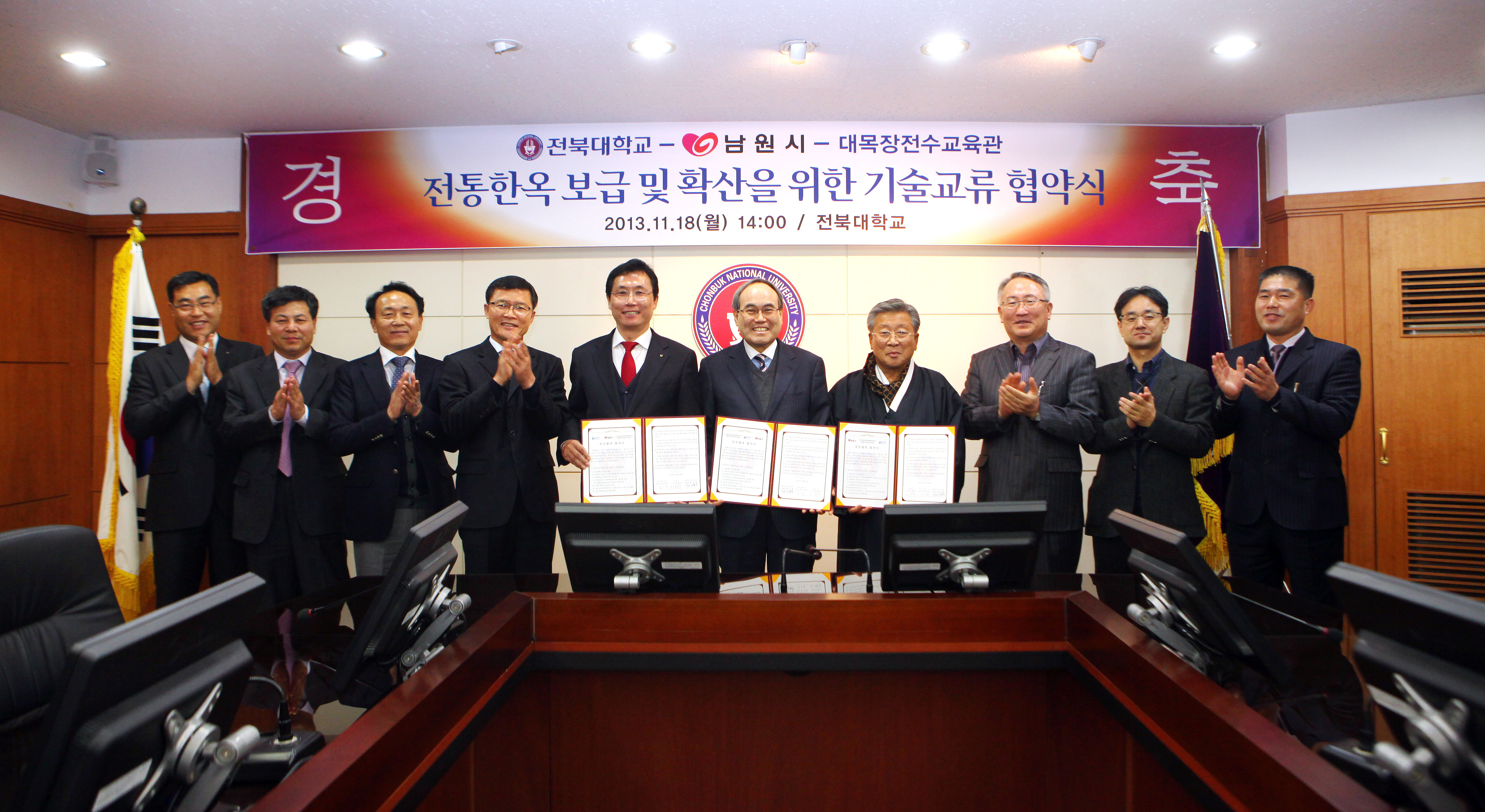 이번 협약은 지난해 국가지정 중요무형문화재 제74호 최기영 대목장 전수교육관과 한옥 건축 실무 교육을 위한 협약을 체결, 협력을 지속해오고 있는 전북대가 남원시에 한옥건축단지 조성을 통한 매력적인 도시공간을 재창조 해나가기 위한 것.