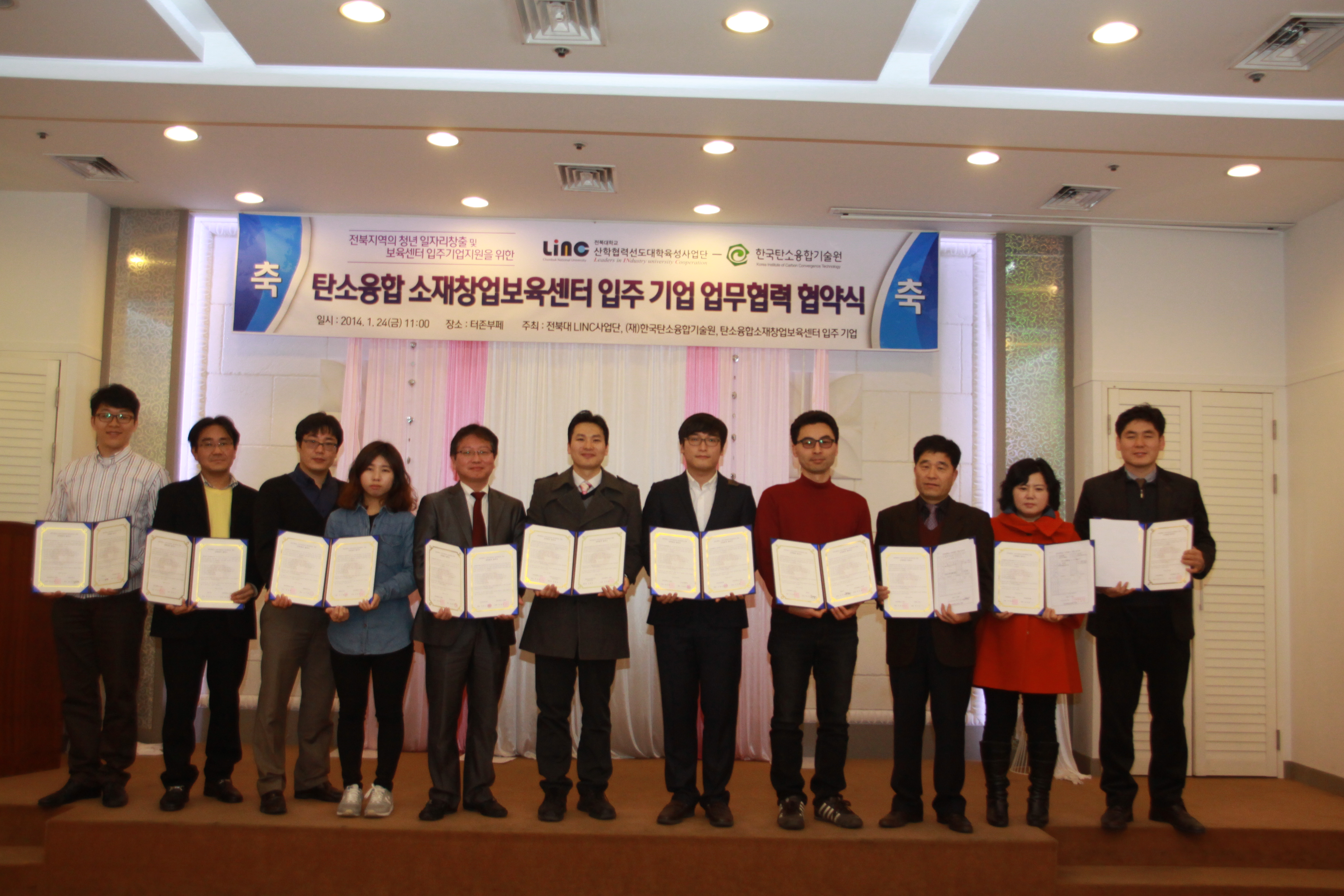 이를 위해 우리대학 LINC사업단(단장 설경원)과 한국탄소융합기술원의 13개 창업보육센터 입주기업들은 1월 24일 오후 상호 협력과 지원 시스템 구축을 골자로 하는 가족회사 협약을 체결했다. 이로써 한국탄소융합기술원 창업보육센터에 입주한 13개 기업들은 우리대학 가족회사롸 등록돼 시제품 제작지원 및 국내외 전시회 참가비용 지원 등 다양한 혜택을 받게 된다.