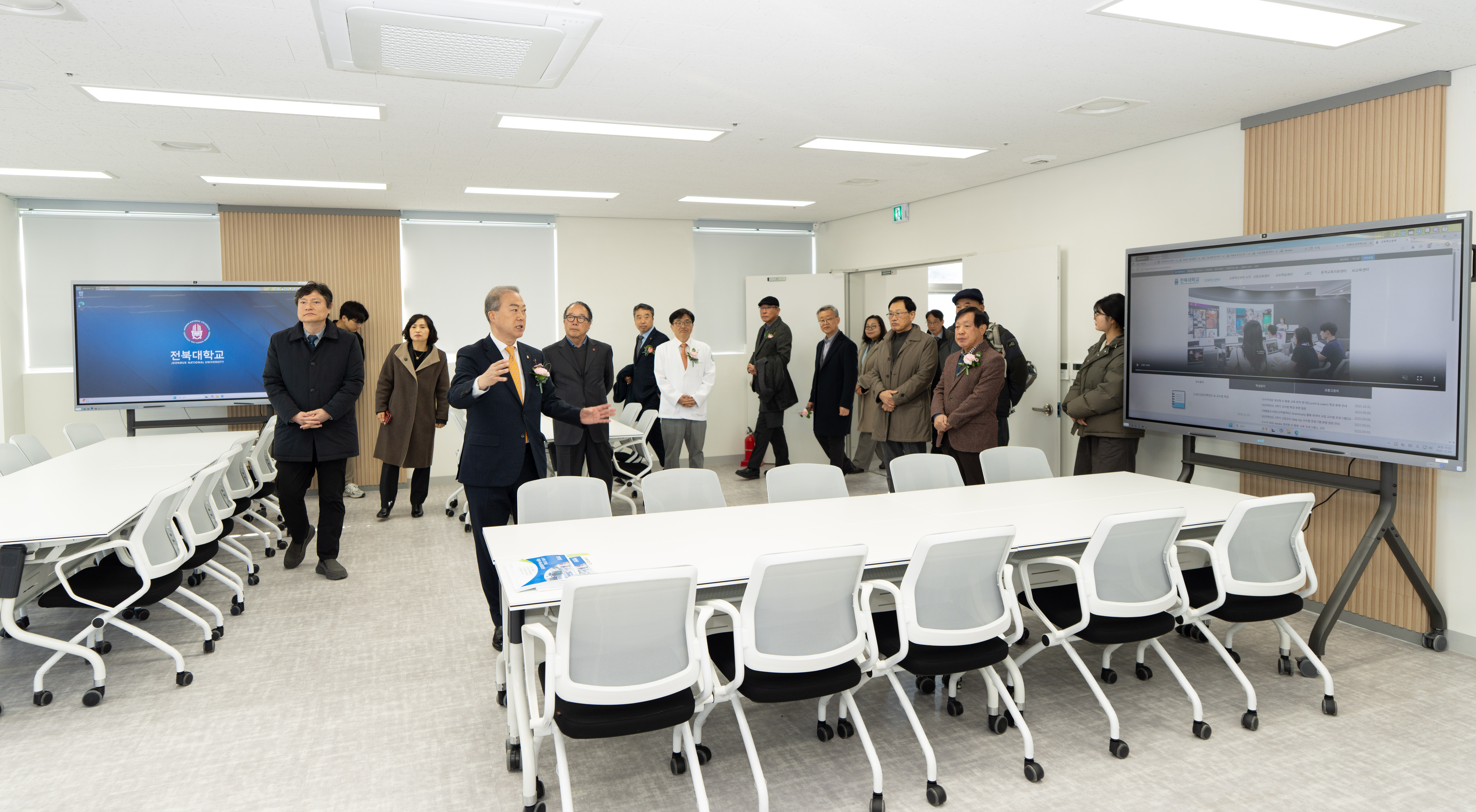 Innovations in learning environments aimed at future education are also notable. On the fourth floor, JBNU's first two advanced lecture rooms using the PBL (Problem-Based Learning) approach have been established. A large surround-style lecture hall accommodating 116 people and a standard lecture room for about 80 people are equipped with electronic whiteboards, flexible movable desks, and group-collaboration ICT equipment, enabling classes centered on discussion, team projects, and problem solving.