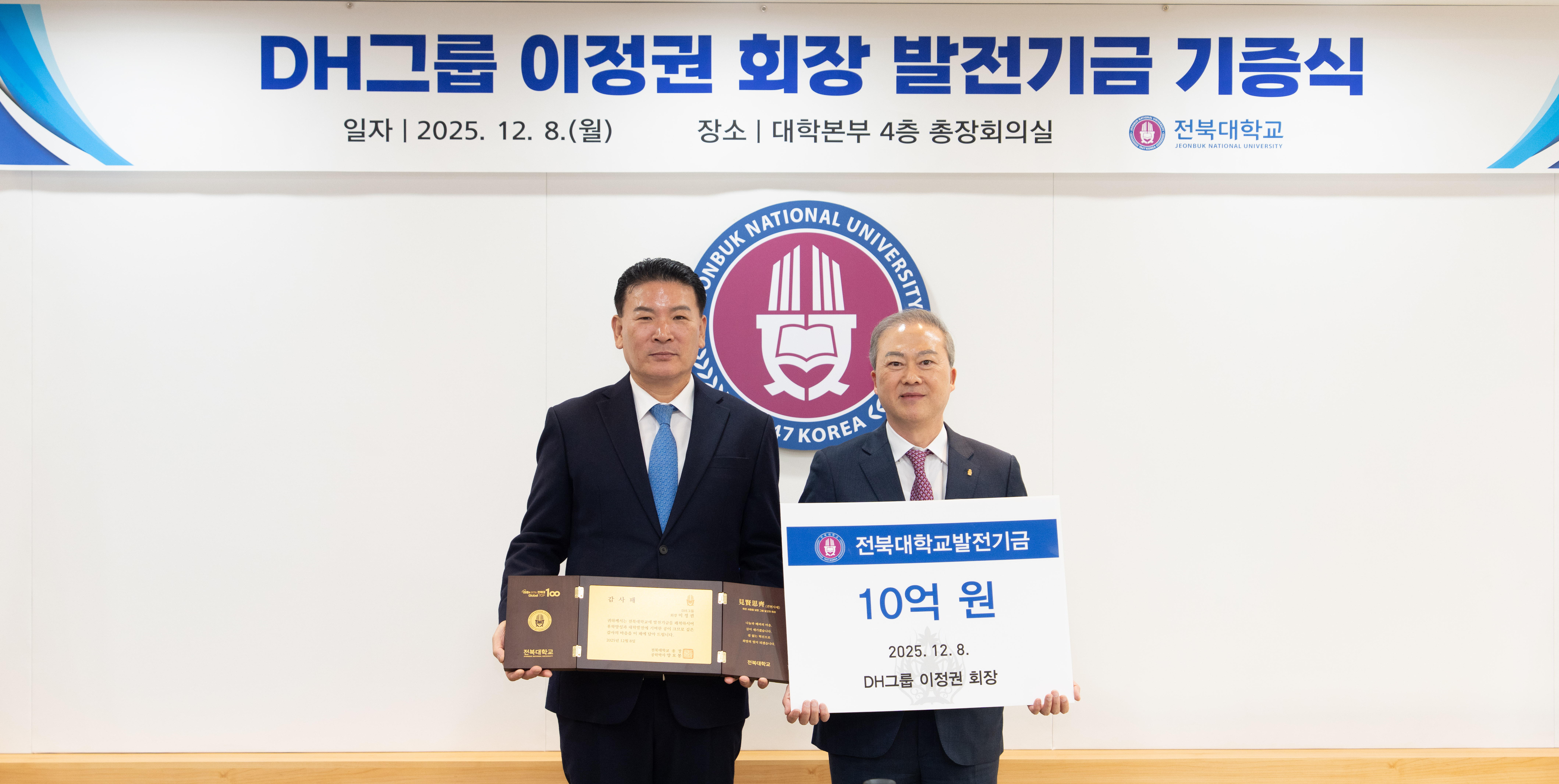 Jeonbuk National University (JBNU) announced on the 8th that DH Group Chairman Lee Jeong-kwon donated KRW 1 billion to its development fund to foster regional talent and will provide scholarships worth KRW 100 million annually.