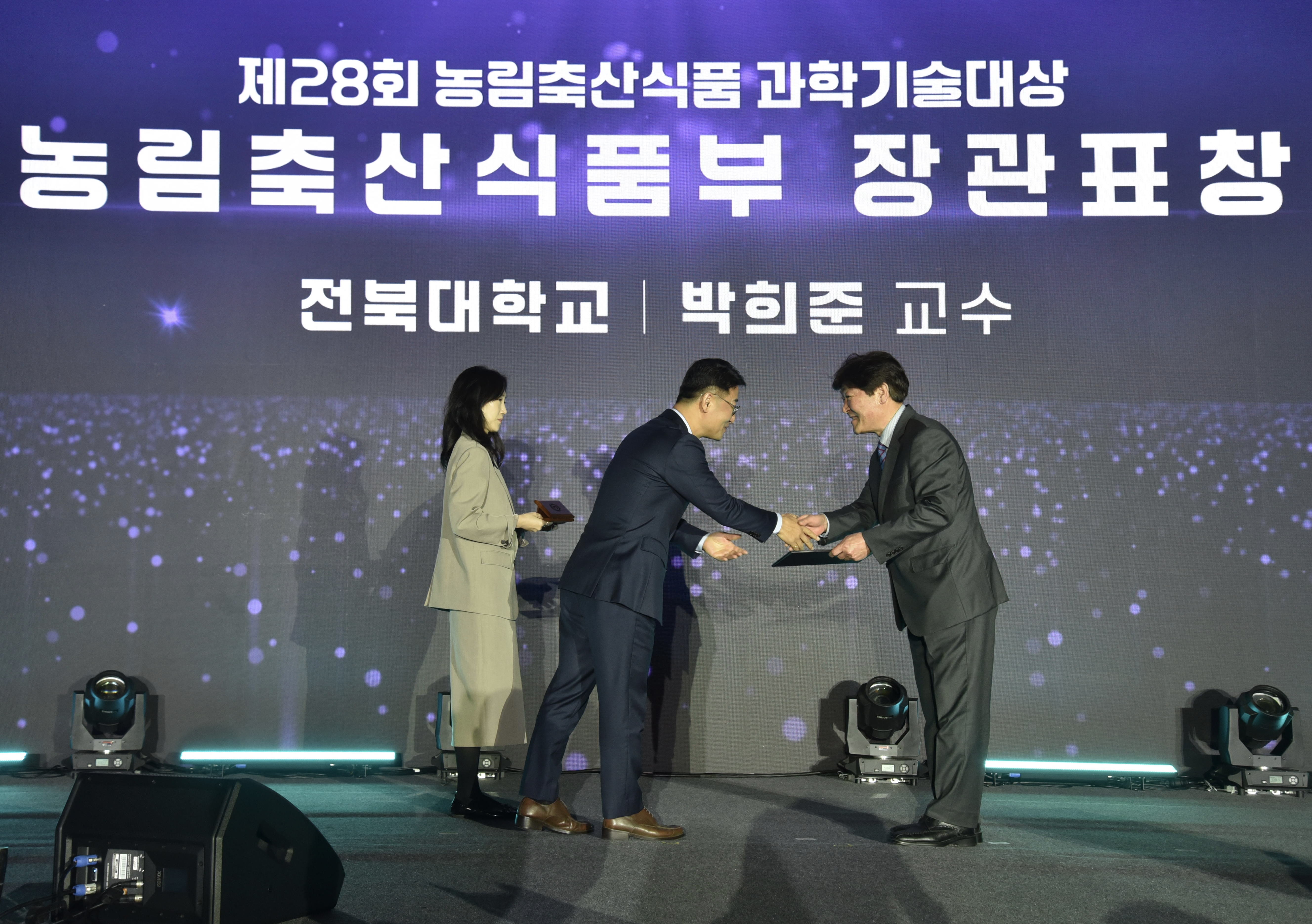 Jeonbuk National University (JBNU) Professor Hee‑jun Park (College of Human Ecology, Department of Housing Environmental Design) received the Minister's Award in the Academic Research and Technology category at the 28th Ministry of Agriculture, Food and Rural Affairs Science and Technology Awards ceremony held recently, in recognition of outstanding research achievements through the High‑Value‑Added Wood Resource Advanced Technology Development Project.