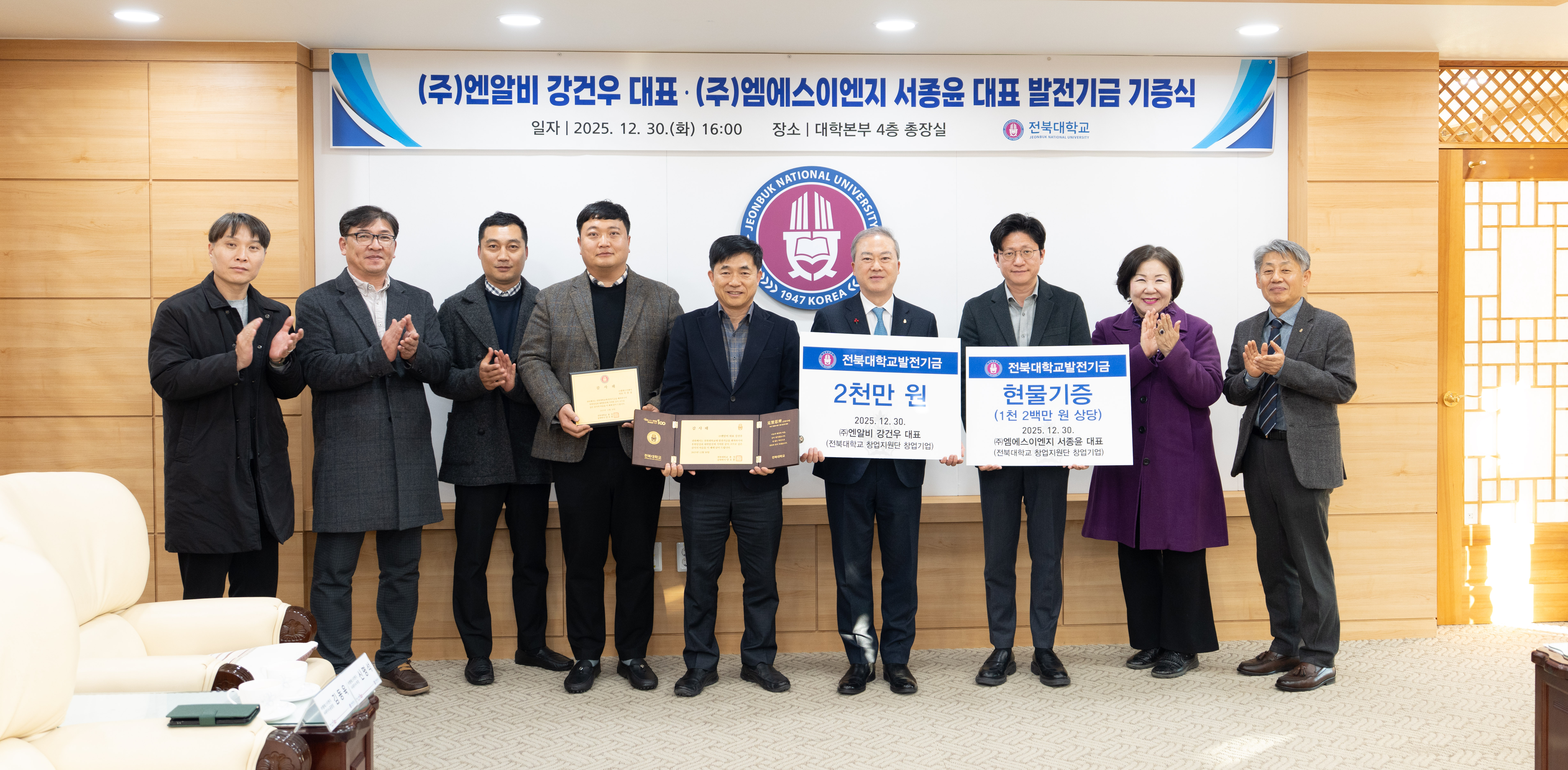 Through support from Jeonbuk National University (JBNU)’s Startup Support Center and the Business Incubator, companies that have grown into competitive small and medium-sized enterprises with global competitiveness have made generous donations to the university and the local community. NRB Co., Ltd. (CEO Kang Geon-woo) donated KRW 20 million, and MSEng Co., Ltd. (CEO Seo Jong-yoon) donated in-kind goods worth KRW 12 million to the university development fund.