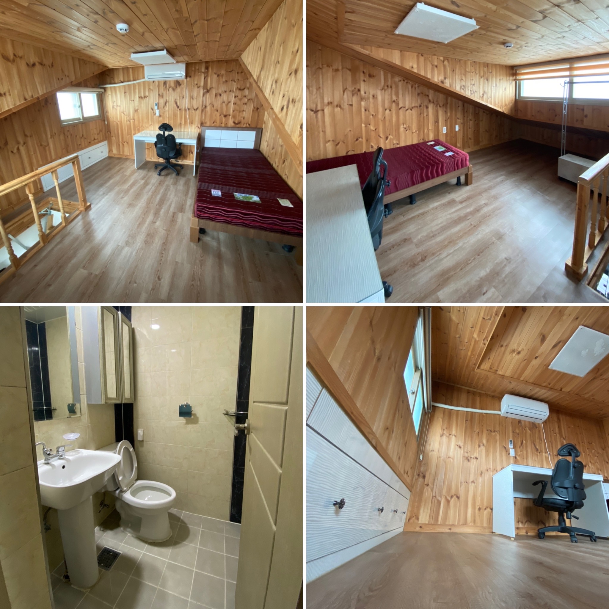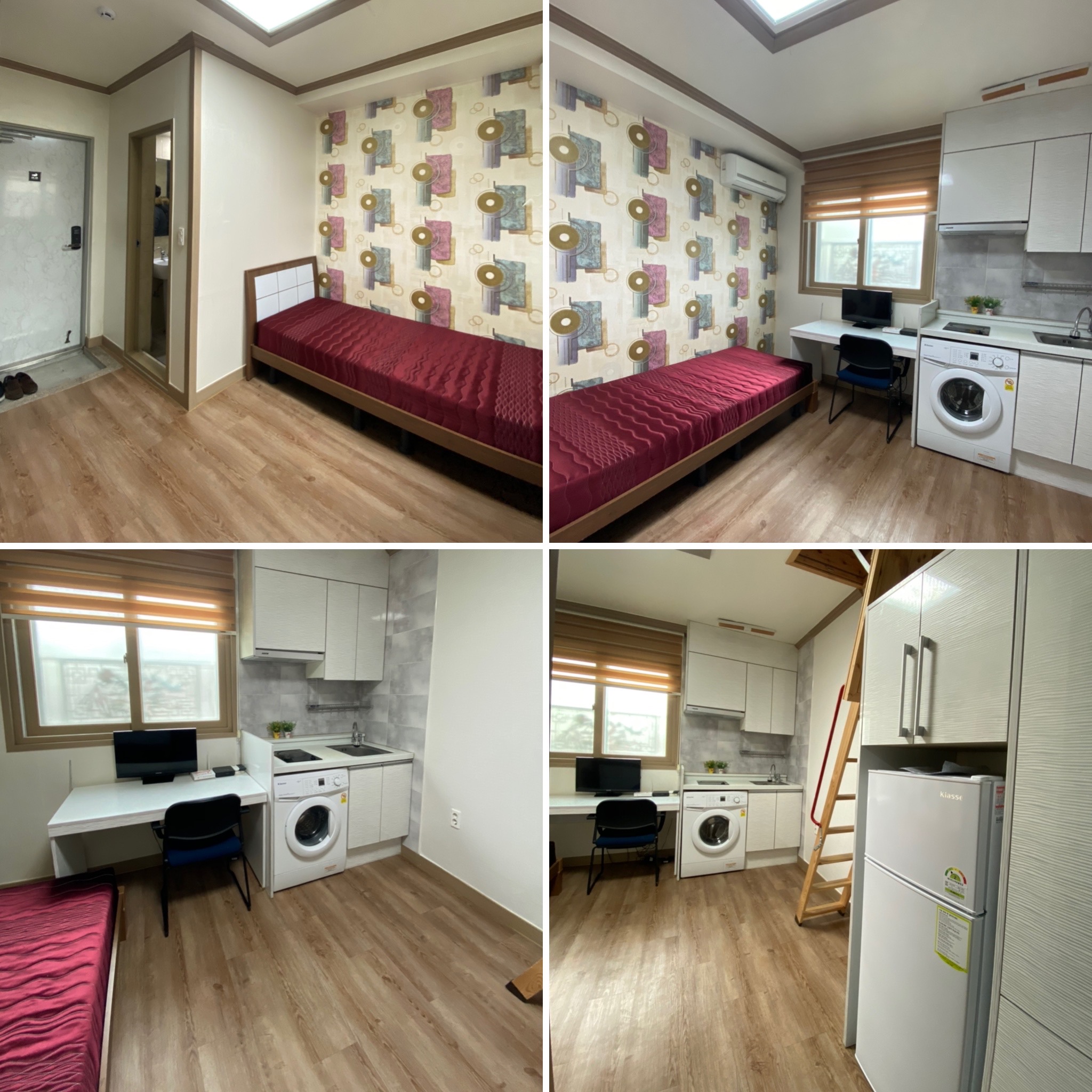 각 방마다 개인용 에어컨, 드럼세탁기, 냉장고, 인덕션, 전자렌지, 전자도어락, 침대, 책상, 의자, 수납및옷장, 신발장등