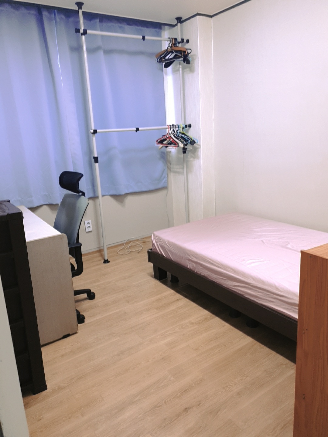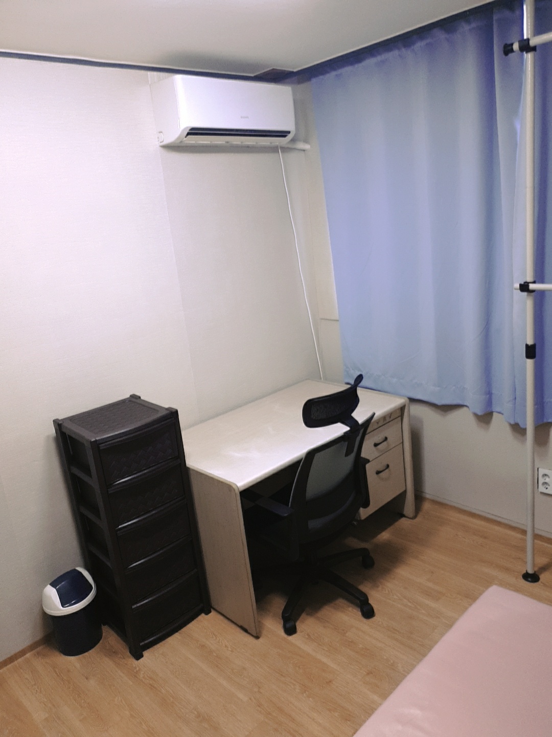 방에 에어컨 침대 , 책상, 행거 다 있어서 개인 용품만 가져 오시면 되고요,