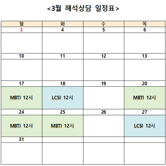 ○ 4월 심리검사 신청 일정은 3월 넷째주 월요일(3/17)에 확인할 수 있습니다.