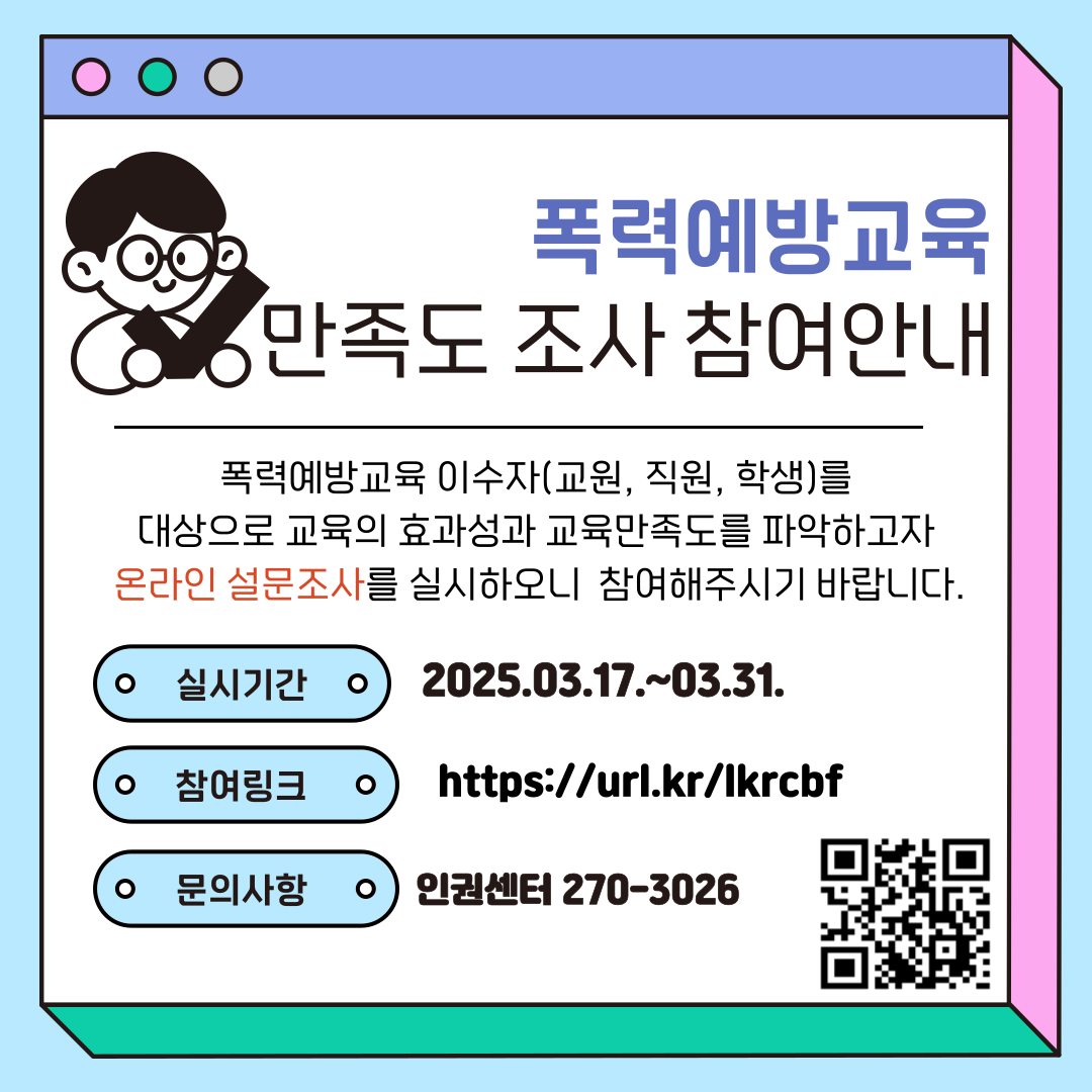 우리대학 구성원의 폭력예방교육 실시에 따른 효과성을 파악하고 교육 전반에 대한 의견 청취를 통해 구성원의 교육 참여도 향상 방안을 구축하고자 2024년도 폭력예방교육 만족도 조사를 실시하오니, 많은 구성원의 참여 바랍니다.