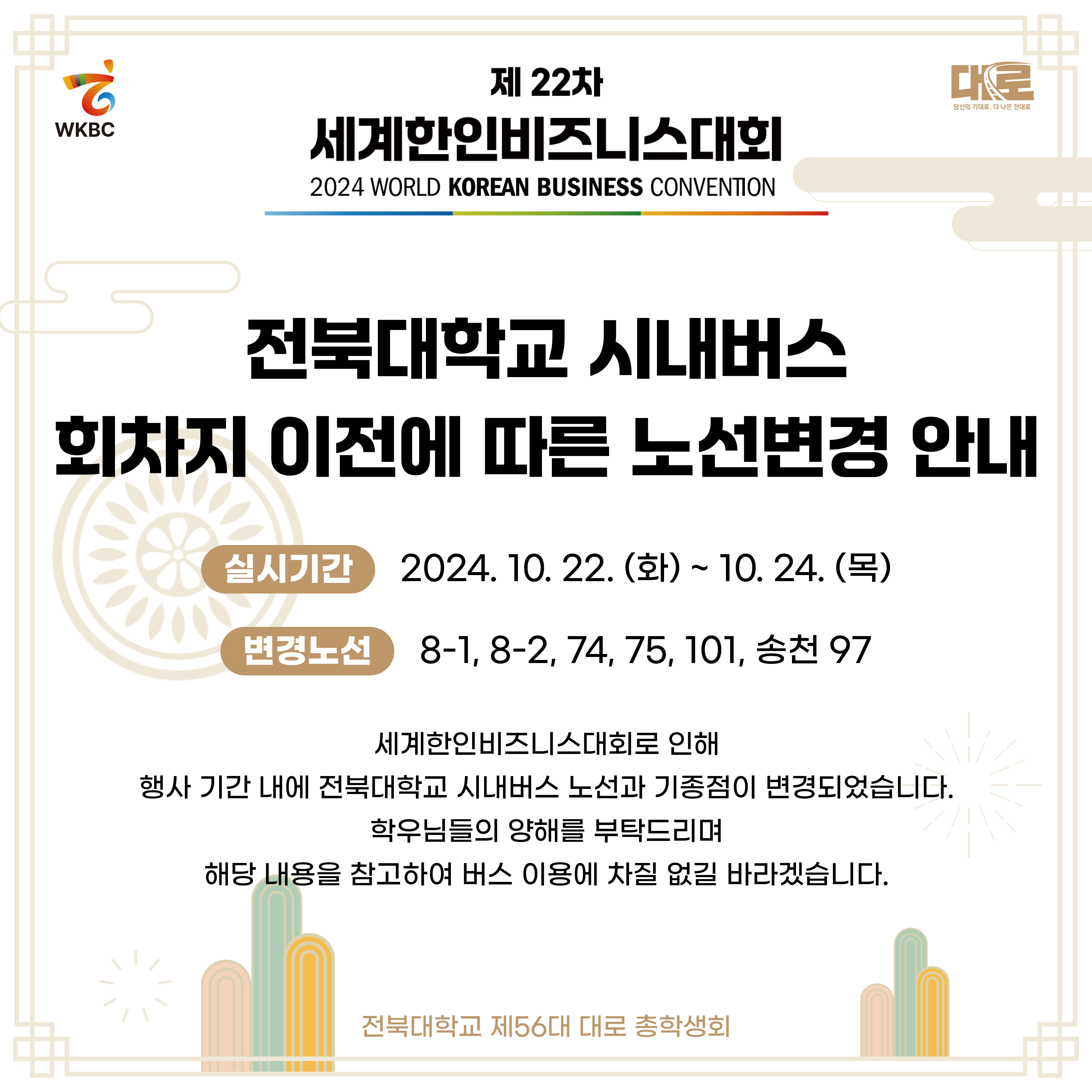 #학우님들의_기대로_더_나은_전대로_향하는_삼백여섯_번째_길 [세계한인비즈니스대회 기간 내 전북대학교 시내버스 회차지 이전에 따른 노선변경 안내] 안녕하세요, 전북대학교 제56대 대로 총학생회입니다. 세계한인비즈니스대회 기간 내에 시내버스가 전북대학교 교내를 운행하지 않으며, 기종점이 구)법원 부지로 변경됩니다. 대회의 원활한 진행을 위해 변경하오니 학우님들의 양해 부탁드리겠습니다. 실시기간: 2024. 10. 22. (화) ~ 10. 24. (목) 변경노선: 8-1, 8-2, 74, 75, 101, 송천 97 감사합니다.