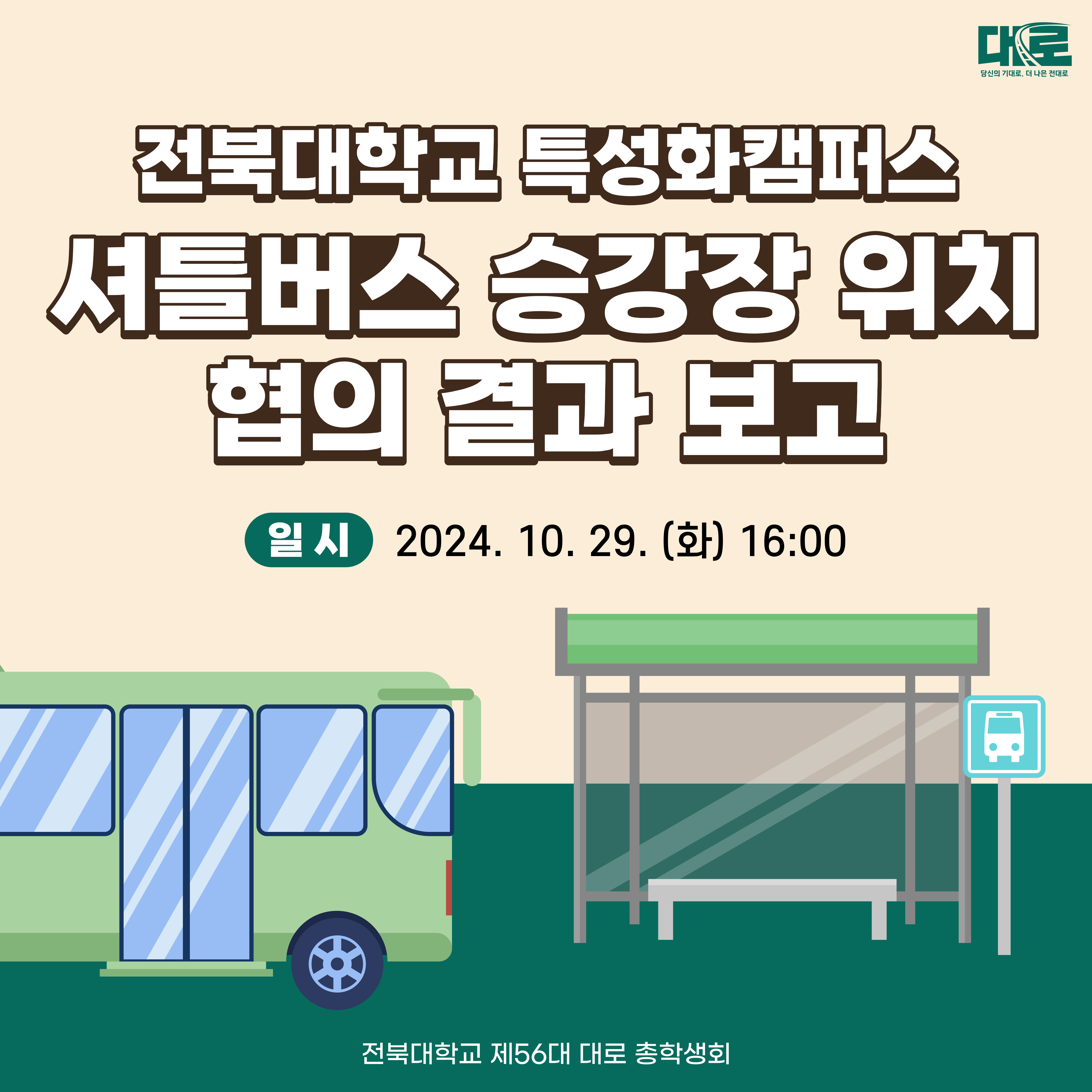 안녕하세요, 전북대학교 제56대 대로 총학생회입니다. 금일 특성화캠퍼스 셔틀버스 승강장의 위치 변경에 관련해서 대학본부 측과 협의를 진행하였습니다. 2024 세계한인비즈니스대회로 인해 변경되었던 북문 주차장의 승강장은 10월 30일부터 11월 1일까지만 승하차가 진행됩니다. 11월 4일부터는 사범대학 과학관 인근 위치인 승강장에서 승하차가 진행되오니 참고 부탁드립니다.