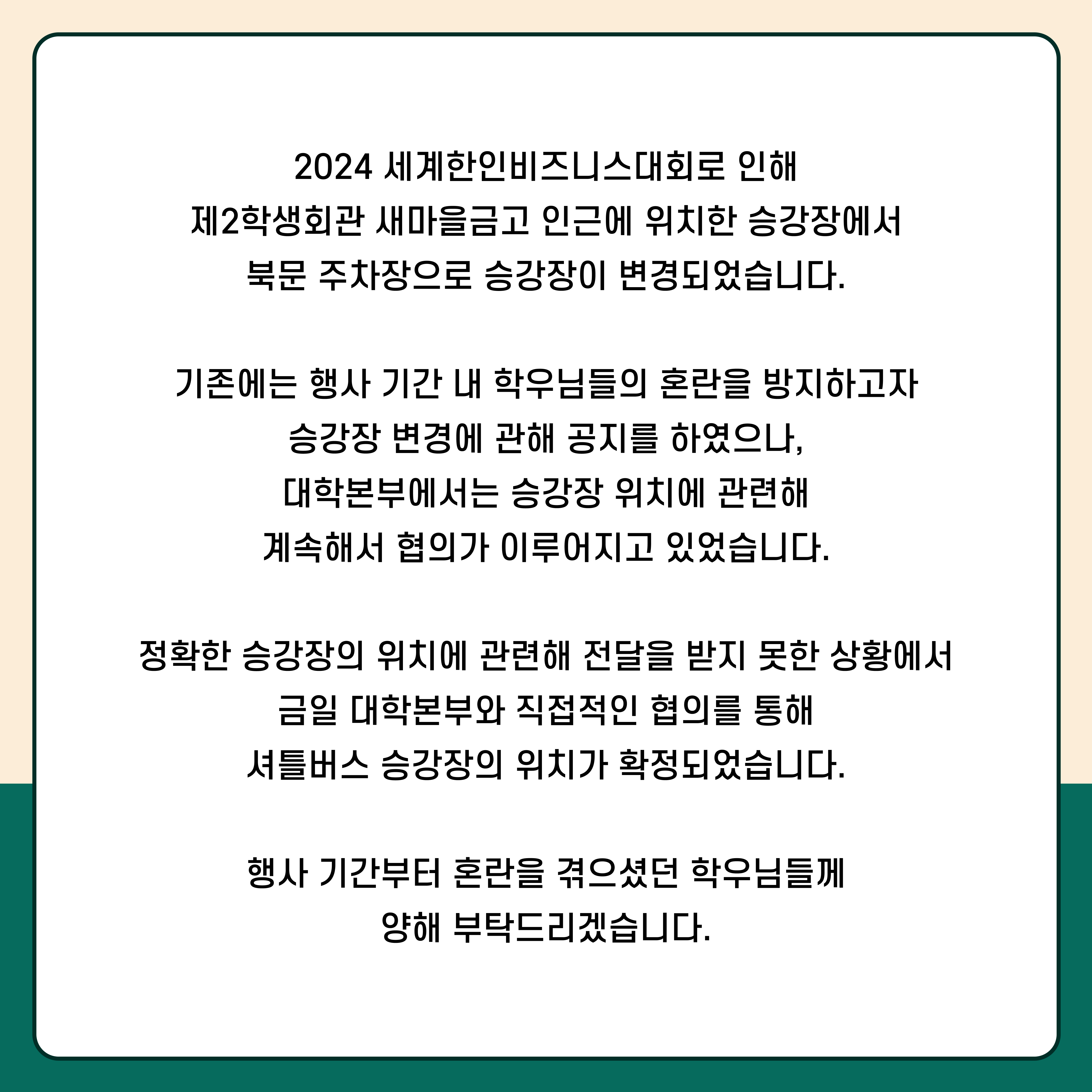 기존에는 2024 세계한인비즈니스대회 행사 기간 내에 학우님들의 혼란을 방지하고자 승강장 변경에 관해 공지를 하였으나, 대학본부에서는 승강장 위치에 관련해서 계속해서 협의가 이루어지고 있었습니다. 정확한 승강장의 위치에 관련해서 전달을 못 받고 있는 상황에서 금일 대학본부와 직접적인 협의를 통해 셔틀버스 승강장의 위치가 확정되었습니다. 행사 기간부터 혼란을 겪으셨던 학우님들께 양해 부탁드리겠습니다.