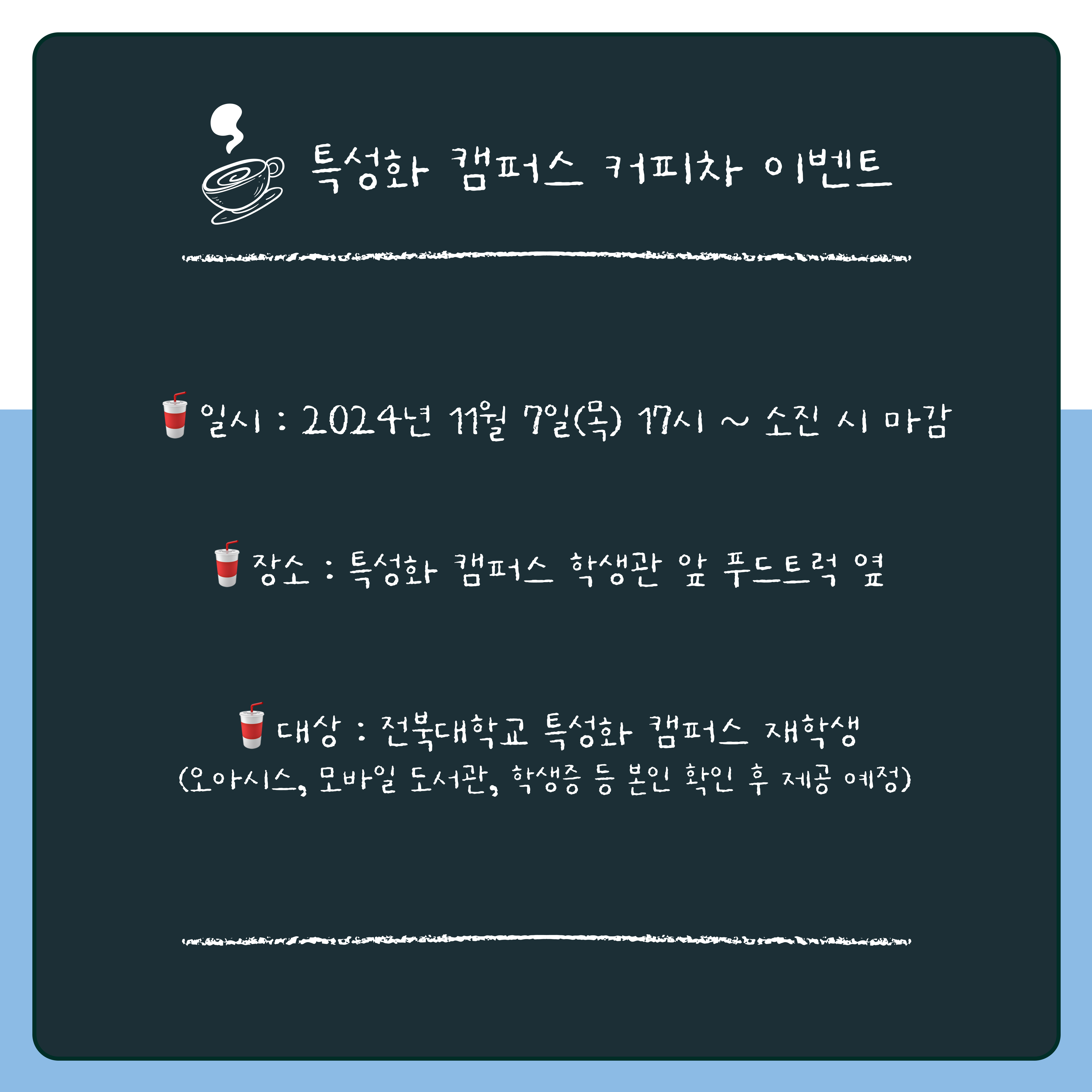 🥤 대상 : 전북대학교 특성화 캠퍼스 재학생(본인 확인 후 제공 예정)