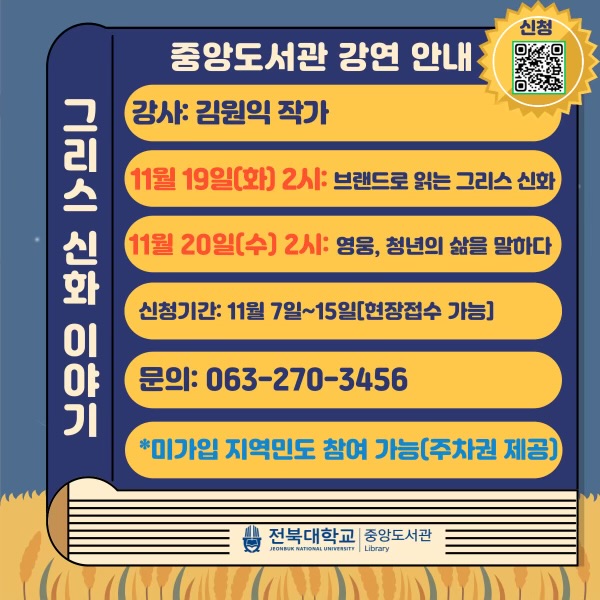 강연주제: 11월 19일(1회)-브랜드로 읽는 그리스 신화 / 11월20일(2회)-영웅, 청년의 삶을 말하다