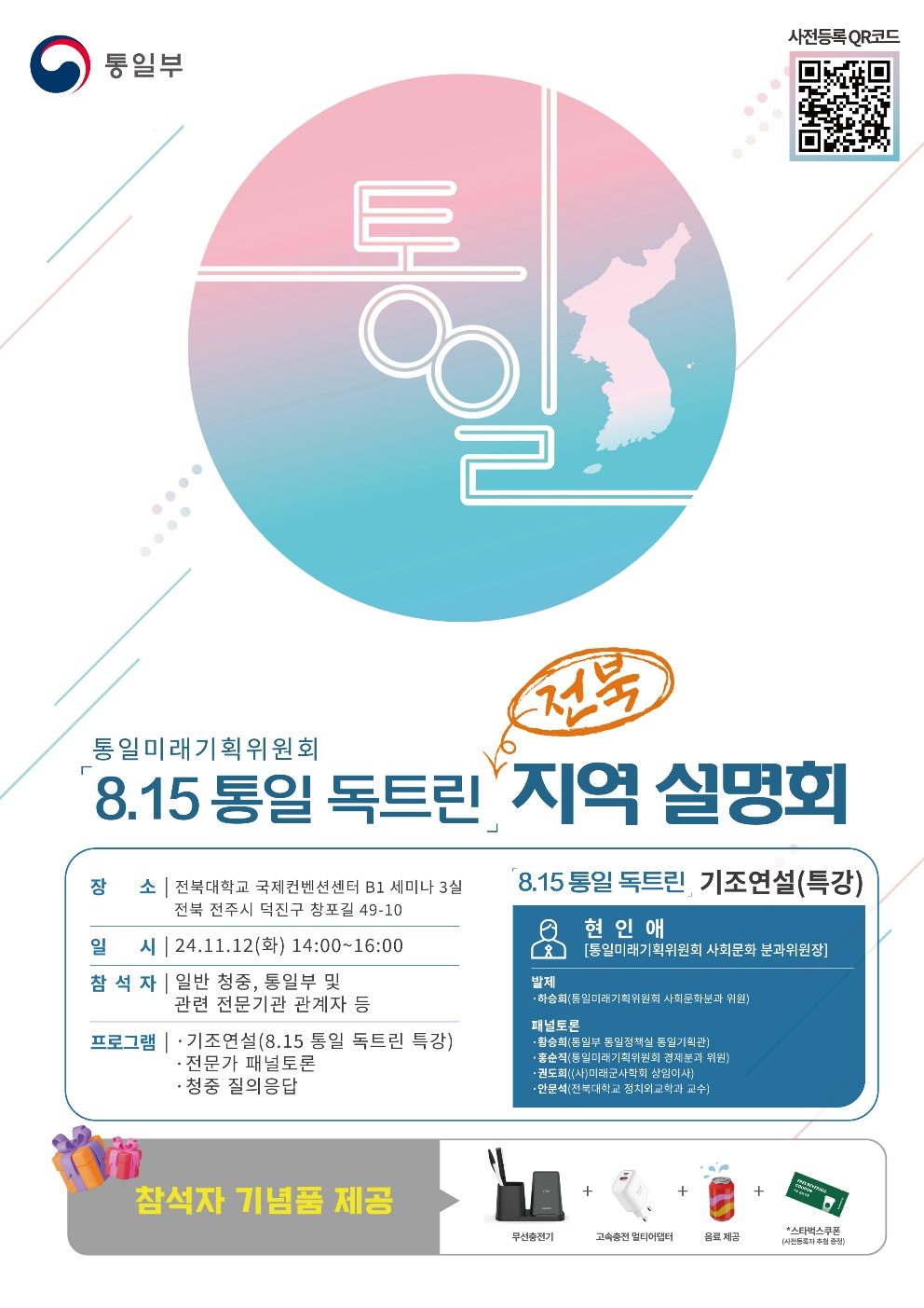 정부(통일부)에서 8.15 통일 이라는 주제로 강의가 진행되며 잠시 오셔서 무료 특강도 듣고 휴대폰 무선충전기, 멀티고속충전어댑터, 음료도 드시고 스타벅스커피쿠폰(사전등록자 추천) 받아가세요!