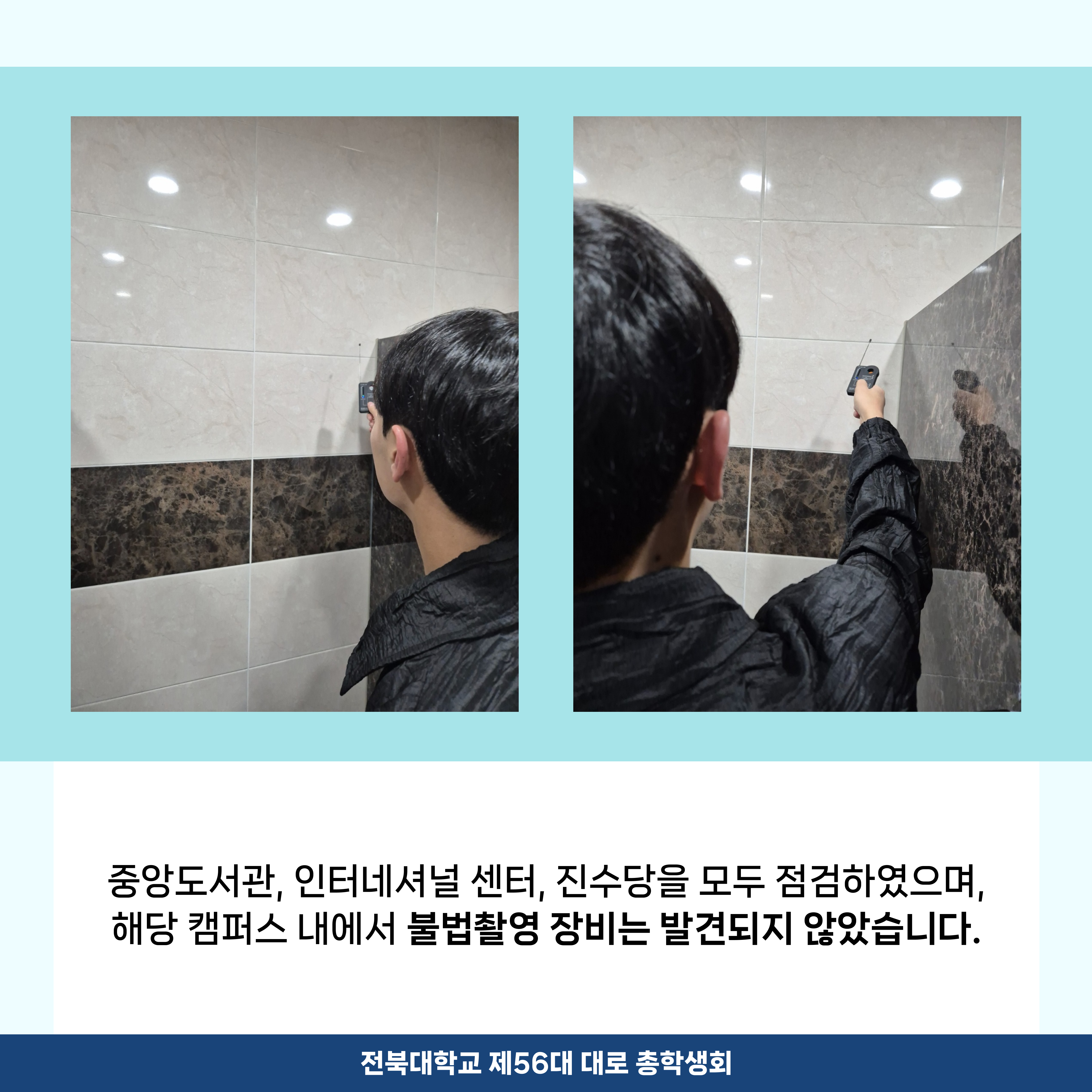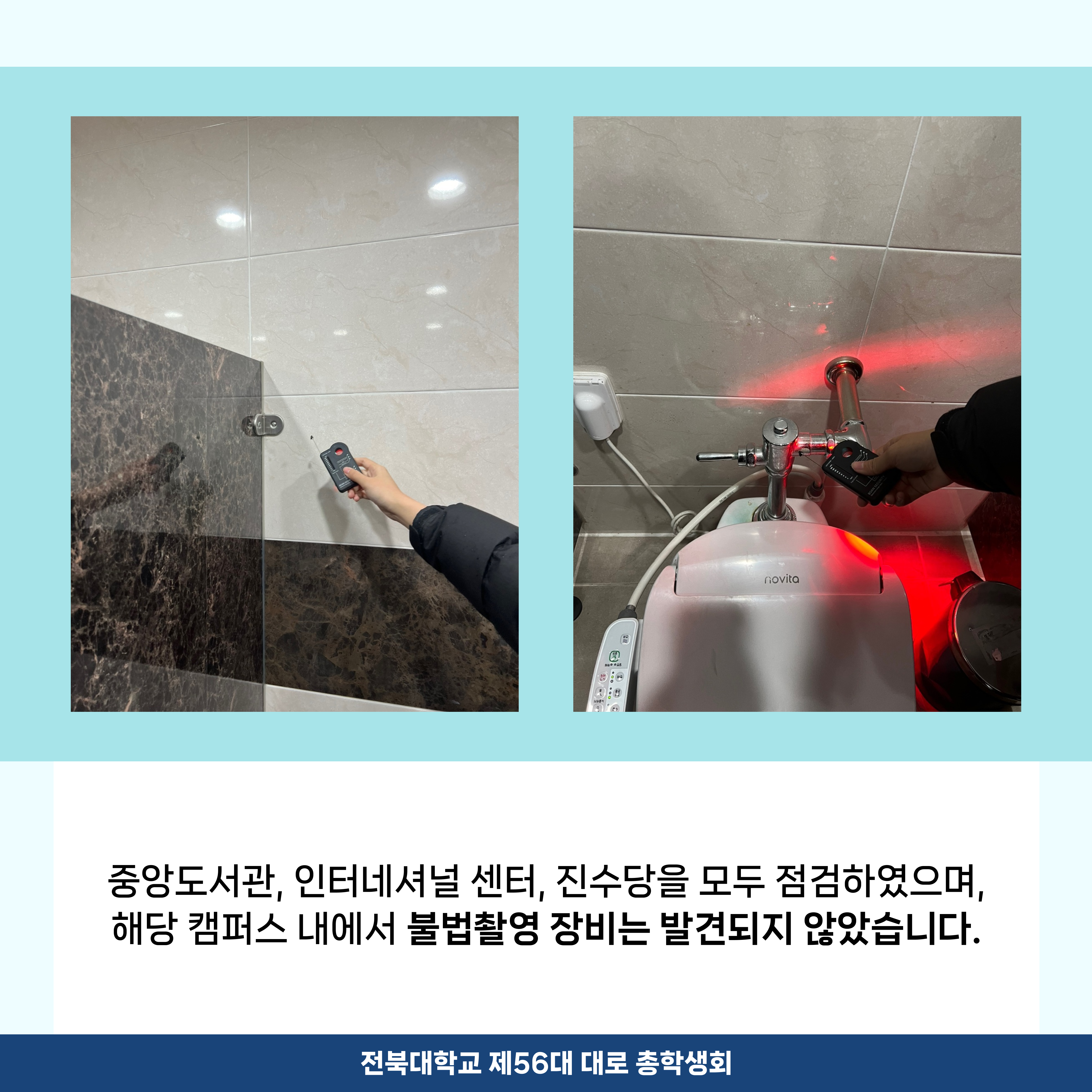 학우님들께서 안심하고 화장실을 이용하실 수 있도록, 총학생회에서 불법 촬영 장비에 대해 11월 상시 점검 완료를 알립니다.