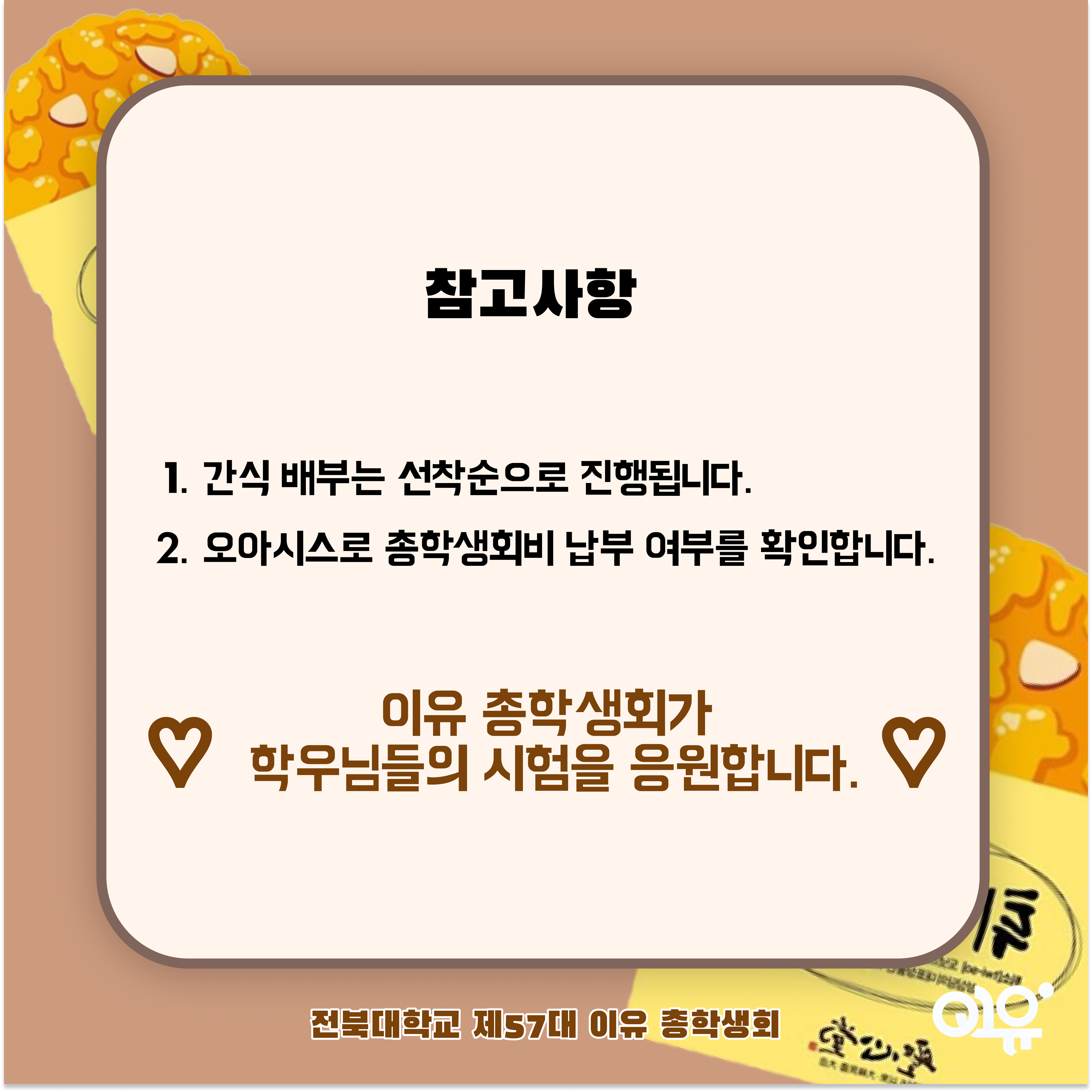 기말고사 기간을 맞아 지친 학우분들을 응원하며 간식사업을 진행할 예정입니다.