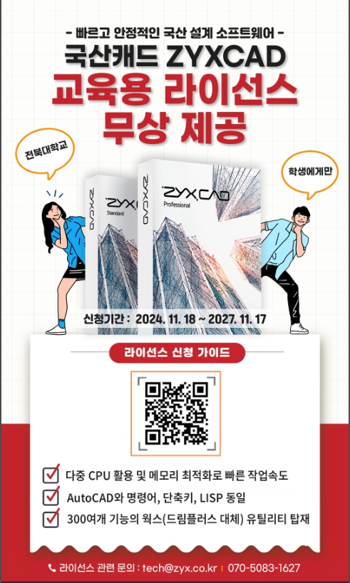 우리대학은 인공지능 설계 소프트웨어기업 (주)직스테크놀로지와 업무협약을 체결하고, 아래와 같이 직스캐드(ZYXCAD)를 무상으로 제공하고 있으니 참고 바랍니다.