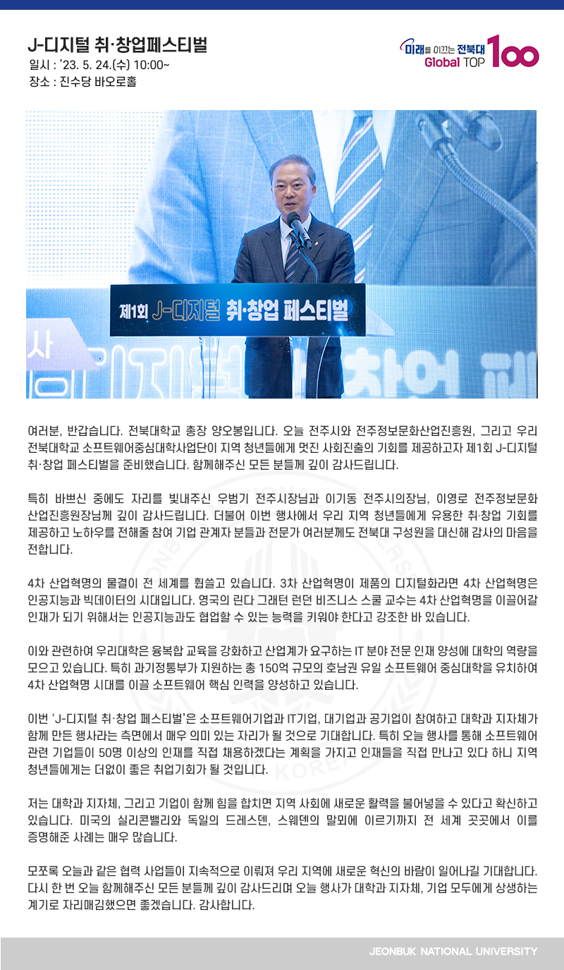 여러분, 반갑습니다. 전북대학교 총장 양오봉입니다. 오늘 전주시와 전주정보문화산업진흥원, 그리고 우리 전북대학교 소프트웨어중심대학사업단이 지역 청년들에게 멋진 사회진출의 기회를 제공하고자 제1회 J-디지털 취·창업 페스티벌을 준비했습니다. 함께해주신 모든 분들께 깊이 감사드립니다.