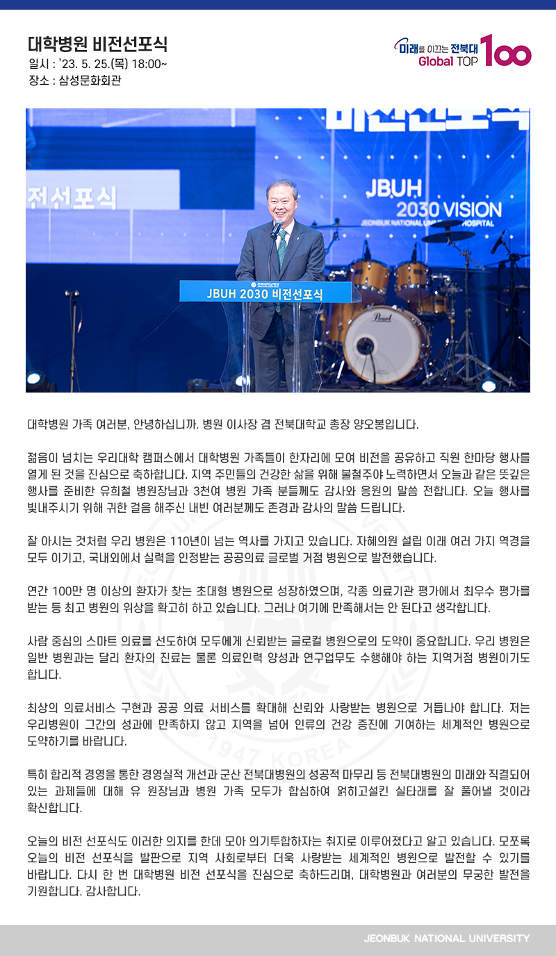 대학병원 가족 여러분, 안녕하십니까. 병원 이사장 겸 전북대학교 총장 양오봉입니다. 젊음이 넘치는 우리대학 캠퍼스에서 대학병원 가족들이 한자리에 모여 비전을 공유하고 직원 한마당 행사를 열게 된 것을 진심으로 축하합니다. 지역 주민들의 건강한 삶을 위해 불철주야 노력하면서 오늘과 같은 뜻깊은 행사를 준비한 유희철 병원장님과 3천여 병원 가족 분들께도 감사와 응원의 말씀 전합니다. 오늘 행사를 빛내주시기 위해 귀한 걸음 해주신 내빈 여러분께도 존경과 감사의 말씀 드립니다. 잘 아시는 것처럼 우리 병원은 110년이 넘는 역사를 가지고 있습니다. 자혜의원 설립 이래 여러 가지 역경을 모두 이기고, 국내외에서 실력을 인정받는 공공의료 글로벌 거점 병원으로 발전했습니다. 연간 100만 명 이상의 환자가 찾는 초대형 병원으로 성장하였으며, 각종 의료기관 평가에서 최우수 평가를 받는 등 최고 병원의 위상을 확고히 하고 있습니다. 그러나 여기에 만족해서는 안 된다고 생각합니다. 사람 중심의 스마트 의료를 선도하여 모두에게 신뢰받는 글로컬 병원으로의 도약이 중요합니다. 우리 병원은 일반 병원과는 달리 환자의 진료는 물론 의료인력 양성과 연구업무도 수행해야 하는 지역거점 병원이기도 합니다. 최상의 의료서비스 구현과 공공 의료 서비스를 확대해 신뢰와 사랑받는 병원으로 거듭나야 합니다. 저는 우리병원이 그간의 성과에 만족하지 않고 지역을 넘어 인류의 건강 증진에 기여하는 세계적인 병원으로 도약하기를 바랍니다. 특히 합리적 경영을 통한 경영실적 개선과 군산 전북대병원의 성공적 마무리 등 전북대병원의 미래와 직결되어 있는 과제들에 대해 유 원장님과 병원 가족 모두가 합심하여 얽히고설킨 실타래를 잘 풀어낼 것이라 확신합니다. 오늘의 비전 선포식도 이러한 의지를 한데 모아 의기투합하자는 취지로 이루어졌다고 알고 있습니다. 모쪼록 오늘의 비전 선포식을 발판으로 지역 사회로부터 더욱 사랑받는 세계적인 병원으로 발전할 수 있기를 바랍니다. 다시 한 번 대학병원 비전 선포식을 진심으로 축하드리며, 대학병원과 여러분의 무궁한 발전을 기원합니다. 감사합니다.