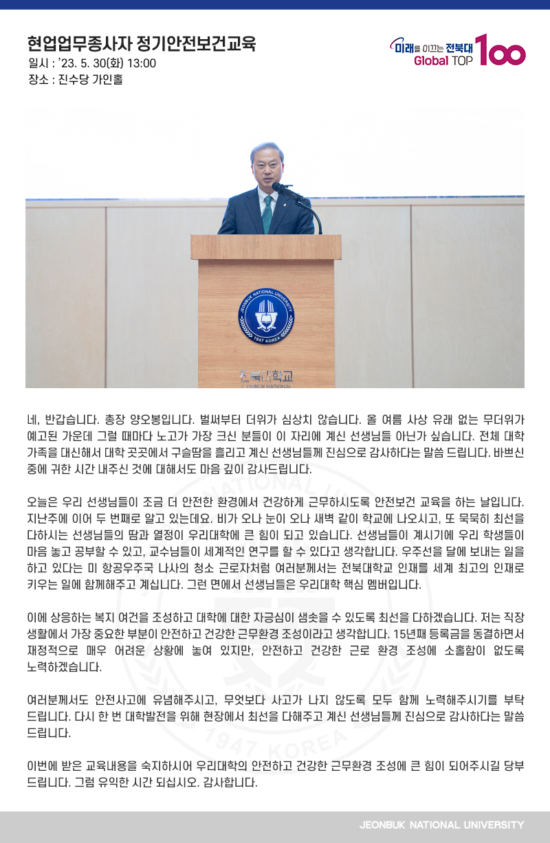 네, 반갑습니다. 총장 양오봉입니다. 벌써부터 더위가 심상치 않습니다. 올 여름 사상 유래 없는 무더위가 예고된 가운데 그럴 때마다 노고가 가장 크신 분들이 이 자리에 계신 선생님들 아닌가 싶습니다. 전체 대학 가족을 대신해서 대학 곳곳에서 구슬땀을 흘리고 계신 선생님들께 진심으로 감사하다는 말씀 드립니다. 바쁘신 중에 귀한 시간 내주신 것에 대해서도 마음 깊이 감사드립니다. 오늘은 우리 선생님들이 조금 더 안전한 환경에서 건강하게 근무하시도록 안전보건 교육을 하는 날입니다. 지난주에 이어 두 번째로 알고 있는데요. 비가 오나 눈이 오나 새벽 같이 학교에 나오시고, 또 묵묵히 최선을 다하시는 선생님들의 땀과 열정이 우리대학에 큰 힘이 되고 있습니다. 선생님들이 계시기에 우리 학생들이 마음 놓고 공부할 수 있고, 교수님들이 세계적인 연구를 할 수 있다고 생각합니다. 우주선을 달에 보내는 일을 하고 있다는 미 항공우주국 나사의 청소 근로자처럼 여러분께서는 전북대학교 인재를 세계 최고의 인재로 키우는 일에 함께해주고 계십니다. 그런 면에서 선생님들은 우리대학 핵심 멤버입니다. 이에 상응하는 복지 여건을 조성하고 대학에 대한 자긍심이 샘솟을 수 있도록 최선을 다하겠습니다. 저는 직장 생활에서 가장 중요한 부분이 안전하고 건강한 근무환경 조성이라고 생각합니다. 15년째 등록금을 동결하면서 재정적으로 매우 어려운 상황에 놓여 있지만, 안전하고 건강한 근로 환경 조성에 소홀함이 없도록 노력하겠습니다. 여러분께서도 안전사고에 유념해주시고, 무엇보다 사고가 나지 않도록 모두 함께 노력해주시기를 부탁드립니다. 다시 한 번 대학발전을 위해 현장에서 최선을 다해주고 계신 선생님들께 진심으로 감사하다는 말씀 드립니다. 이번에 받은 교육내용을 숙지하시어 우리대학의 안전하고 건강한 근무환경 조성에 큰 힘이 되어주시길 당부 드립니다. 그럼 유익한 시간 되십시오. 감사합니다.
