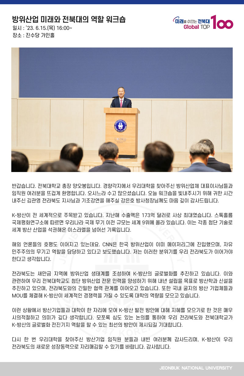 반갑습니다. 전북대학교 총장 양오봉입니다. 경향각지에서 우리대학을 찾아주신 방위산업체 대표이사님들과 임직원 여러분을 뜨겁게 환영합니다. 오시느라 수고 많으셨습니다. 오늘 워크숍을 빛내주시기 위해 귀한 시간 내주신 김관영 전라북도 지사님과 기조강연을 해주실 강은호 방사청장님께도 마음 깊이 감사드립니다. K-방산이 전 세계적으로 주목받고 있습니다. 지난해 수출액은 173억 달러로 사상 최대였습니다. 스톡홀름 국제평화연구소에 따르면 우리나라 국제 무기 이전 규모는 세계 9위에 올라 있습니다. 이는 각종 첨단 기술로 세계 방산 산업을 석권해온 이스라엘을 넘어선 기록입니다. 해외 언론들의 호평도 이어지고 있는데요. CNN은 한국 방위산업이 이미 메이저리그에 진입했으며, 자유민주주의의 무기고 역할을 담당하고 있다고 보도했습니다. 저는 이러한 분위기를 우리 전라북도가 이어가야 한다고 생각합니다. 전라북도는 새만금 지역에 방위산업 생태계를 조성하여 K-방산의 글로벌화를 추진하고 있습니다. 이와 관련하여 우리 전북대학교도 첨단 방위산업 전문 인력을 양성하기 위해 내년 설립을 목표로 방산학과 신설을 추진하고 있으며, 전라북도와의 긴밀한 협력 관계를 이어오고 있습니다. 또한 국내 굴지의 방산 기업체들과 MOU를 체결해 K-방산이 세계적인 경쟁력을 가질 수 있도록 대학의 역량을 모으고 있습니다. 이런 상황에서 방산기업들과 대학이 한 자리에 모여 K-방산 발전 방안에 대해 지혜를 모으기로 한 것은 매우 시의적절하고 의미가 깊다 생각합니다. 모쪼록 심도 있는 논의를 통하여 우리 전라북도와 전북대학교가 K-방산의 글로벌화 전진기지 역할을 할 수 있는 최선의 방안이 제시되길 기대합니다. 다시 한 번 우리대학을 찾아주신 방산기업 임직원 분들과 내빈 여러분께 감사드리며, K-방산이 우리 전라북도의 새로운 성장동력으로 자리매김할 수 있기를 바랍니다. 감사합니다.