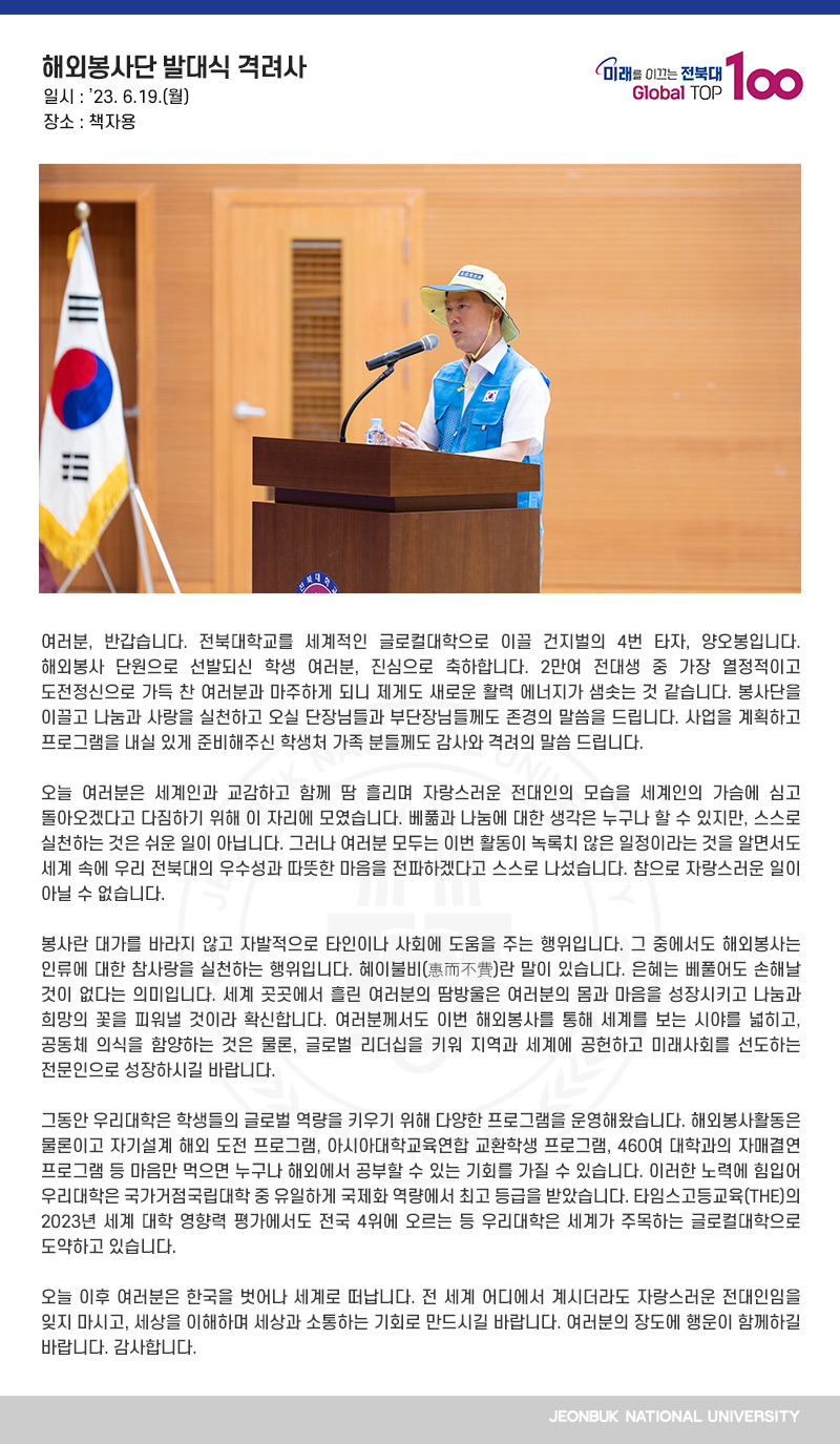 여러분, 반갑습니다. 전북대학교를 세계적인 글로컬대학으로 이끌 건지벌의 4번 타자, 양오봉입니다. 해외봉사 단원으로 선발되신 학생 여러분, 진심으로 축하합니다. 2만여 전대생 중 가장 열정적이고 도전정신으로 가득 찬 여러분과 마주하게 되니 제게도 새로운 활력 에너지가 샘솟는 것 같습니다. 봉사단을 이끌고 나눔과 사랑을 실천하고 오실 단장님들과 부단장님들께도 존경의 말씀을 드립니다. 사업을 계획하고 프로그램을 내실 있게 준비해주신 학생처 가족 분들께도 감사와 격려의 말씀 드립니다.