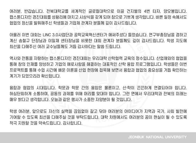 여러분, 반갑습니다. 전북대학교를 세계적인 글로컬대학으로 이끌 건지벌의 4번 타자, 양오봉입니다. 캡스톤디자인 경진대회를 성황리에 마치고 시상식을 갖게 되어 참으로 기쁘게 생각합니다. 바쁜 일정 속에서도 협업의 정신을 발휘해주신 학생들과 기업체 관계자 분들께 깊이 감사드립니다. 아울러 이번 대회는 LINC 3.0사업단과 공학교육혁신센터가 애써주셨다 들었습니다. 연구부총장님을 겸하고 계신 송철규 단장님과 이일재 센터장님을 비롯한 대회 관계자 분들께도 깊이 감사드립니다. 학생 지도에 최선을 다해주신 여러 교수님들께도 거듭 감사하다는 말씀 드립니다. 역사와 전통을 자랑하는 캡스톤디자인 경진대회는 우리대학 산학협력 교육의 정수입니다. 산업체와의 협업을 통해 창의 인재를 양성하고 기업의 애로사항을 해결하는 대표적인 산학 융합 프로그램입니다. 학생들은 이번 프로젝트를 통해 수업 시간에 배운 이론을 산업 현장에 접목해 보면서 융합과 협업의 중요성을 거듭 확인하는 계기가 되었으리라 확신합니다. 융합과 협업의 시대입니다. 학문과 학문 간의 융합은 물론이고, 산‧학이 끈끈하게 연결되어야 합니다. 허심탄회하게 소통하며, 공동의 과제를 위해 머리를 맞대야 합니다. 그런 면에서 우리대학과 전북의 미래는 매우 밝다고 생각합니다. 오늘과 같은 행사가 소중한 자양분이 될 것입니다. 학생 여러분, 앞으로도 자신의 실력을 끊임없이 갈고 닦아 여러분의 아이디어가 지역과 국가, 사회 발전에 기여할 수 있도록 최선을 다해주실 것을 부탁드립니다. 대학 차원에서도 여러분의 꿈이 현실이 될 수 있도록 적극 지원할 것을 약속드립니다. 감사합니다.