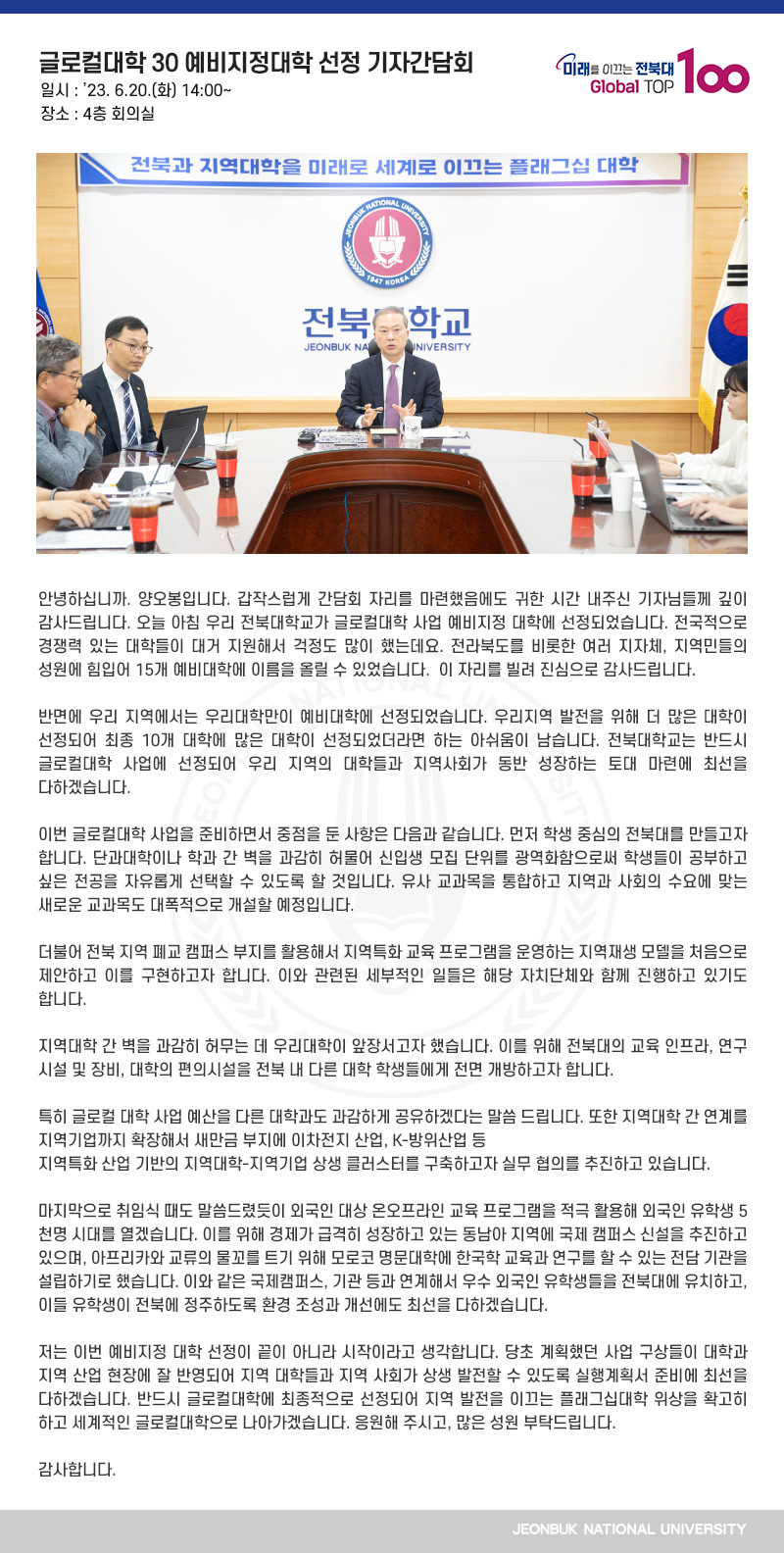 안녕하십니까. 양오봉입니다. 갑작스럽게 간담회 자리를 마련했음에도 귀한 시간 내주신 기자님들께 깊이 감사드립니다. 오늘 아침 우리 전북대학교가 글로컬대학 사업 예비지정 대학에 선정되었습니다. 전국적으로 경쟁력 있는 대학들이 대거 지원해서 걱정도 많이 했는데요. 전라북도를 비롯한 여러 지자체, 지역민들의 성원에 힘입어 15개 예비대학에 이름을 올릴 수 있었습니다. 이 자리를 빌려 진심으로 감사드립니다. 반면에 우리 지역에서는 우리대학만이 예비대학에 선정되었습니다. 우리지역 발전을 위해 더 많은 대학이 선정되어 최종 10개 대학에 많은 대학이 선정되었더라면 하는 아쉬움이 남습니다. 전북대학교는 반드시 글로컬대학 사업에 선정되어 우리 지역의 대학들과 지역사회가 동반 성장하는 토대 마련에 최선을 다하겠습니다. 이번 글로컬대학 사업을 준비하면서 중점을 둔 사항은 다음과 같습니다. 먼저 학생 중심의 전북대를 만들고자 합니다. 단과대학이나 학과 간 벽을 과감히 허물어 신입생 모집 단위를 광역화함으로써 학생들이 공부하고 싶은 전공을 자유롭게 선택할 수 있도록 할 것입니다. 유사 교과목을 통합하고 지역과 사회의 수요에 맞는 새로운 교과목도 대폭적으로 개설할 예정입니다. 더불어 전북 지역 폐교 캠퍼스 부지를 활용해서 지역특화 교육 프로그램을 운영하는 지역재생 모델을 처음으로 제안하고 이를 구현하고자 합니다. 이와 관련된 세부적인 일들은 해당 자치단체와 함께 진행하고 있기도 합니다. 지역대학 간 벽을 과감히 허무는 데 우리대학이 앞장서고자 했습니다. 이를 위해 전북대의 교육 인프라, 연구 시설 및 장비, 대학의 편의시설을 전북 내 다른 대학 학생들에게 전면 개방하고자 합니다. 특히 글로컬 대학 사업 예산을 다른 대학과도 과감하게 공유하겠다는 말씀 드립니다. 또한 지역대학 간 연계를 지역기업까지 확장해서 새만금 부지에 이차전지 산업, K-방위산업 등 지역특화 산업 기반의 지역대학-지역기업 상생 클러스터를 구축하고자 실무 협의를 추진하고 있습니다. 마지막으로 취임식 때도 말씀드렸듯이 외국인 대상 온오프라인 교육 프로그램을 적극 활용해 외국인 유학생 5천명 시대를 열겠습니다. 이를 위해 경제가 급격히 성장하고 있는 동남아 지역에 국제 캠퍼스 신설을 추진하고 있으며, 아프리카와 교류의 물꼬를 트기 위해 모로코 명문대학에 한국학 교육과 연구를 할 수 있는 전담 기관을 설립하기로 했습니다. 이와 같은 국제캠퍼스, 기관 등과 연계해서 우수 외국인 유학생들을 전북대에 유치하고, 이들 유학생이 전북에 정주하도록 환경 조성과 개선에도 최선을 다하겠습니다. 저는 이번 예비지정 대학 선정이 끝이 아니라 시작이라고 생각합니다. 당초 계획했던 사업 구상들이 대학과 지역 산업 현장에 잘 반영되어 지역 대학들과 지역 사회가 상생 발전할 수 있도록 실행계획서 준비에 최선을 다하겠습니다. 반드시 글로컬대학에 최종적으로 선정되어 지역 발전을 이끄는 플래그십대학 위상을 확고히 하고 세계적인 글로컬대학으로 나아가겠습니다. 응원해 주시고, 많은 성원 부탁드립니다. 감사합니다.