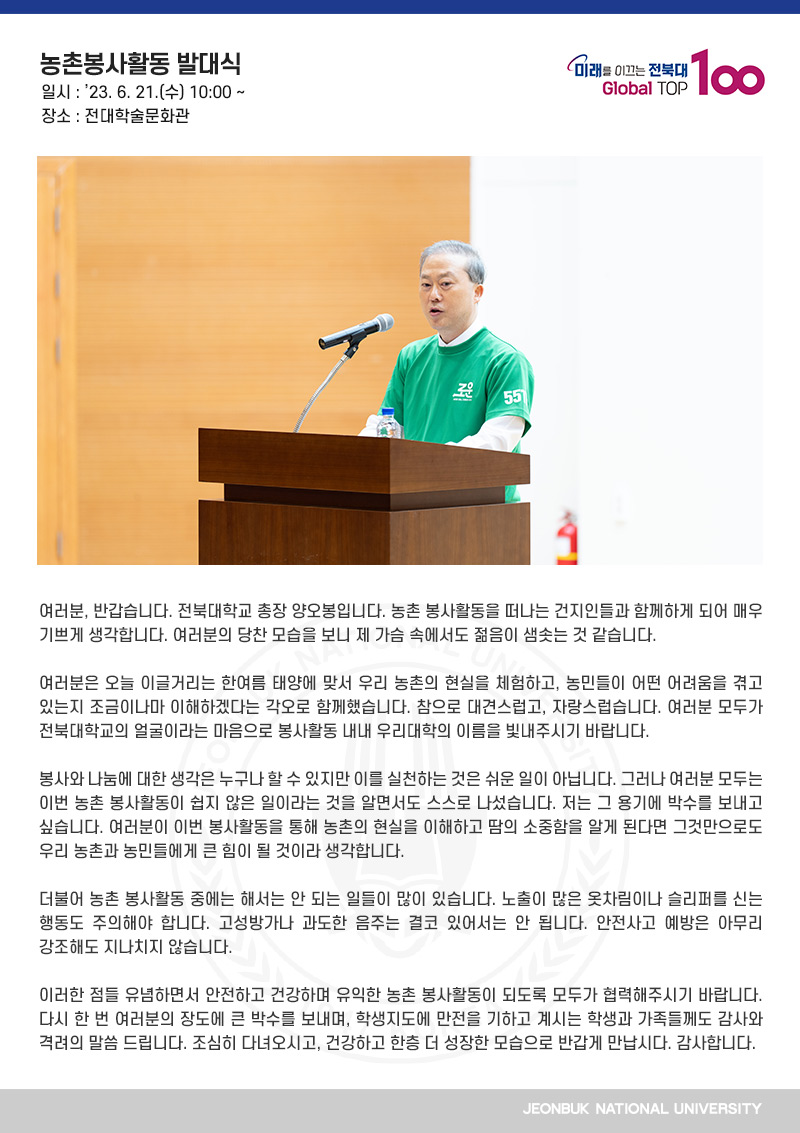 여러분은 오늘 이글거리는 한여름 태양에 맞서 우리 농촌의 현실을 체험하고, 농민들이 어떤 어려움을 겪고 있는지 조금이나마 이해하겠다는 각오로 함께했습니다. 참으로 대견스럽고, 자랑스럽습니다. 여러분 모두가 전북대학교의 얼굴이라는 마음으로 봉사활동 내내 우리대학의 이름을 빛내주시기 바랍니다.