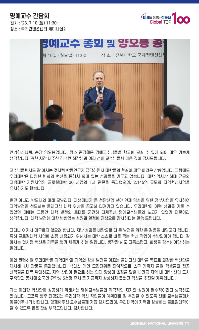 안녕하십니까. 총장 양오봉입니다. 평소 존경해온 명예교수님들을 학교에 모실 수 있게 되어 매우 기쁘게 생각합니다. 귀한 시간 내주신 김석원 회장님과 여러 선배 교수님들께 마음 깊이 감사드립니다. 교수님들께서도 잘 아시는 것처럼 학령인구가 급감하면서 대학들의 현실이 매우 어려운 상황입니다. 그럼에도 우리대학은 다양한 변화와 혁신을 통해서 의미 있는 성과들을 거두고 있습니다. 대학 역사상 최대 규모의 지방대학 지원사업인 글로컬대학 30 사업의 1차 관문을 통과했으며, 2,145억 규모의 지역혁신사업을 유치하기도 했습니다. 뿐만 아니라 반도체와 미래 모빌리티, 재생에너지 등 첨단산업 분야 인재 양성을 위한 정부사업을 유치하여 지역발전을 선도하는 플래그십 대학 위상을 공고히 다져가고 있습니다. 우리대학이 이런 성과를 거둘 수 있었던 데에는 그동안 대학 발전의 토대를 굳건히 다져주신 명예교수님들의 노고가 있었기 때문이라 생각합니다. 대학 발전에 대한 변함없는 성원과 열정에 진심으로 감사하다는 말씀 드립니다. 그러나 여기서 머무르지 않으려 합니다. 지난 성과를 바탕으로 더 큰 발전을 위한 큰 걸음을 내딛고자 합니다. 특히 글로컬대학 사업에 최종 선정되기 위해서는 대학 스스로 뼈를 깎는 혁신 작업이 수반되어야 합니다. 잘 아시는 것처럼 혁신은 가죽을 벗겨 새롭게 하는 일입니다. 생각만 해도 고통스럽고, 희생을 감수해야만 하는 일입니다. 이와 관련하여 우리대학은 지역대학과 지역의 상생 발전을 이끄는 플래그십 대학을 목표로 과감한 혁신안을 제시해 1차 관문을 통과했습니다. 백다섯 개인 모집단위를 단계적으로 스무 개까지 줄여 학생들의 전공 선택권을 대폭 확대하고, 지역 산업이 필요로 하는 인재 양성에 초점을 맞춘 새만금 지역 내 대학-산업 도시 구축함과 동시에 외국인 유학생 5천명 유치 등 지금까지 상상하지 못했던 혁신을 추진할 계획입니다. 저는 이러한 혁신안이 성공하기 위해서는 명예교수님들의 적극적인 지지와 성원이 필수적이라고 생각하고 있습니다. 모쪼록 향후 진행되는 우리대학 혁신 작업들이 계획대로 잘 추진될 수 있도록 선배 교수님들께서 이끌어주시기 바랍니다. 함께해주신 교수님들께 거듭 감사드리며, 우리대학이 지역과 상생하는 글로컬대학이 될 수 있도록 많은 관심 부탁드립니다. 감사합니다.