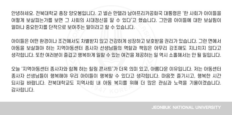 안녕하세요. 전북대학교 총장 양오봉입니다. 고 넬슨 만델라 남아프리카공화국 대통령은 ‘한 사회가 아이들을 어떻게 보살피는가를 보면 그 사회의 시대정신을 알 수 있다’고 했습니다. 그만큼 아이들에 대한 보살핌이 얼마나 중요한지를 단적으로 보여주는 말이라고 할 수 있습니다. 아이들은 어떤 환경이나 조건에서도 차별받지 않고 건강하게 성장하고 보호받을 권리가 있습니다. 그런 면에서 아동을 보살펴야 하는 지역아동센터 종사자 선생님들의 역할과 책임은 아무리 강조해도 지나치지 않다고 생각합니다. 또한 여러분이 즐겁고 행복하게 일할 수 있는 여건을 제공하는 일 역시 소홀해서는 안 될 일입니다. 오늘 ‘지역아동센터 종사자와 함께 하는 힐링 콘서트’가 더욱 의미 있고, 아름다운 이유입니다. 저는 아동센터 종사자 선생님들이 행복해야 우리 아이들이 행복할 수 있다고 생각합니다. 마음껏 즐기시고, 행복한 시간 되시길 바랍니다. 전북대학교도 지역사회 내 아동 복지를 위해 더 많은 관심과 노력을 기울이겠습니다. 감사합니다.