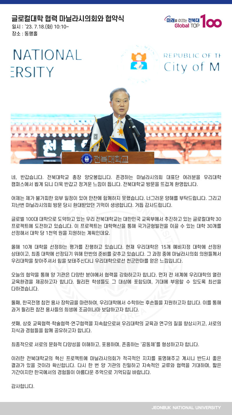 네, 반갑습니다. 전북대학교 총장 양오봉입니다. 존경하는 마닐라시의회 대표단 여러분을 우리대학 캠퍼스에서 뵙게 되니 더욱 반갑고 정겨운 느낌이 듭니다. 전북대학교 방문을 뜨겁게 환영합니다. 어제는 제가 불가피한 외부 일정이 있어 만찬에 함께하지 못했습니다. 너그러운 양해를 부탁드립니다. 그리고 지난번 마닐라시의회 방문 당시 환대받았던 기억이 생생합니다. 거듭 감사드립니다. 글로벌 100대 대학으로 도약하고 있는 우리 전북대학교는 대한민국 교육부에서 추진하고 있는 글로컬대학 30 프로젝트에 도전하고 있습니다. 이 프로젝트는 대학혁신을 통해 국가균형발전을 이끌 수 있는 대학 30개를 선정해서 대학 당 1천억 원을 지원하는 계획인데요. 올해 10개 대학을 선정하는 평가를 진행하고 있습니다. 현재 우리대학은 15개 예비지정 대학에 선정된 상태이고, 최종 대학에 선정되기 위해 만반의 준비를 갖추고 있습니다. 그 과정 중에 마닐라시의회 의원들께서 우리대학을 찾아주셔서 힘을 보태주신다니 우리대학으로선 천군만마를 얻은 느낌입니다. 오늘의 협약을 통해 양 기관은 다양한 분야에서 협력을 강화하고자 합니다. 먼저 전 세계에 우리대학의 열린 교육환경을 제공하고자 합니다. 필리핀 학생들도 그 대상에 포함되며, 기대에 부응할 수 있도록 최선을 다하겠습니다. 둘째, 한국전쟁 참전 용사 장학금을 마련하여, 우리대학에서 수학하는 후손들을 지원하고자 합니다. 이를 통해 과거 필리핀 참전 용사들의 희생에 조금이나마 보답하고자 합니다. 셋째, 상호 교육협력·학술협력·연구협력을 지속함으로써 우리대학의 교육과 연구의 질을 향상시키고, 서로의 지식과 경험들을 함께 공유하고자 합니다. 최종적으로 서로의 문화적 다양성을 이해하고, 포용하며, 존중하는 ‘공동체’를 형성하고자 합니다. 이러한 전북대학교의 혁신 프로젝트에 마닐라시의회가 적극적인 지지를 표명해주고 계시니 반드시 좋은 결과가 있을 것이라 확신합니다. 다시 한 번 양 기관의 친밀하고 지속적인 교류와 협력을 기대하며, 짧은 기간이지만 한국에서의 경험들이 아름다운 추억으로 기억되길 바랍니다. 감사합니다.