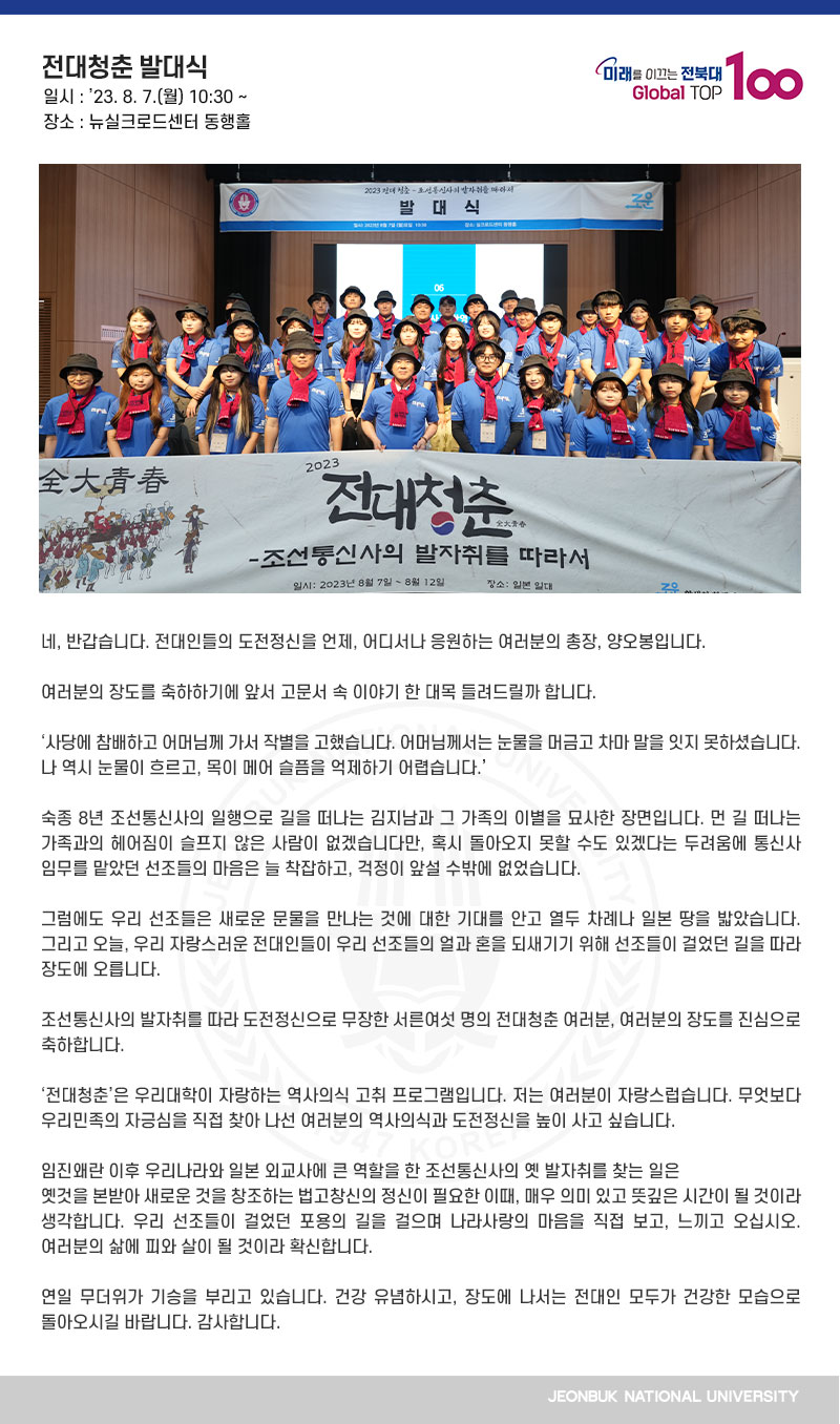 네, 반갑습니다. 전대인들의 도전정신을 언제, 어디서나 응원하는 여러분의 총장, 양오봉입니다. 여러분의 장도를 축하하기에 앞서 고문서 속 이야기 한 대목 들려드릴까 합니다. ‘사당에 참배하고 어머님께 가서 작별을 고했습니다. 어머님께서는 눈물을 머금고 차마 말을 잇지 못하셨습니다. 나 역시 눈물이 흐르고, 목이 메어 슬픔을 억제하기 어렵습니다.’ 숙종 8년 조선통신사의 일행으로 길을 떠나는 김지남과 그 가족의 이별을 묘사한 장면입니다. 먼 길 떠나는 가족과의 헤어짐이 슬프지 않은 사람이 없겠습니다만, 혹시 돌아오지 못할 수도 있겠다는 두려움에 통신사 임무를 맡았던 선조들의 마음은 늘 착잡하고, 걱정이 앞설 수밖에 없었습니다. 그럼에도 우리 선조들은 새로운 문물을 만나는 것에 대한 기대를 안고 열두 차례나 일본 땅을 밟았습니다. 그리고 오늘, 우리 자랑스러운 전대인들이 우리 선조들의 얼과 혼을 되새기기 위해 선조들이 걸었던 길을 따라 장도에 오릅니다. 조선통신사의 발자취를 따라 도전정신으로 무장한 서른여섯 명의 전대청춘 여러분, 여러분의 장도를 진심으로 축하합니다. ‘전대청춘’은 우리대학이 자랑하는 역사의식 고취 프로그램입니다. 저는 여러분이 자랑스럽습니다. 무엇보다 우리민족의 자긍심을 직접 찾아 나선 여러분의 역사의식과 도전정신을 높이 사고 싶습니다. 임진왜란 이후 우리나라와 일본 외교사에 큰 역할을 한 조선통신사의 옛 발자취를 찾는 일은 옛것을 본받아 새로운 것을 창조하는 법고창신의 정신이 필요한 이때, 매우 의미 있고 뜻깊은 시간이 될 것이라 생각합니다. 우리 선조들이 걸었던 포용의 길을 걸으며 나라사랑의 마음을 직접 보고, 느끼고 오십시오. 여러분의 삶에 피와 살이 될 것이라 확신합니다. 연일 무더위가 기승을 부리고 있습니다. 건강 유념하시고, 장도에 나서는 전대인 모두가 건강한 모습으로 돌아오시길 바랍니다. 감사합니다.