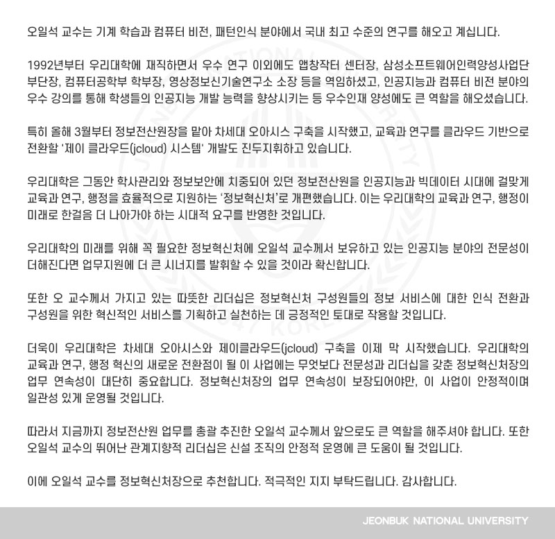 오일석 교수는 기계 학습과 컴퓨터 비전, 패턴인식 분야에서 국내 최고 수준의 연구를 해오고 계십니다. 1992년부터 우리대학에 재직하면서 우수 연구 이외에도 앱창작터 센터장, 삼성소프트웨어인력양성사업단 부단장, 컴퓨터공학부 학부장, 영상정보신기술연구소 소장 등을 역임하셨고, 인공지능과 컴퓨터 비전 분야의 우수 강의를 통해 학생들의 인공지능 개발 능력을 향상시키는 등 우수인재 양성에도 큰 역할을 해오셨습니다. 특히 올해 3월부터 정보전산원장을 맡아 차세대 오아시스 구축을 시작했고, 교육과 연구를 클라우드 기반으로 전환할 '제이 클라우드(jcloud) 시스템' 개발도 진두지휘하고 있습니다. 우리대학은 그동안 학사관리와 정보보안에 치중되어 있던 정보전산원을 인공지능과 빅데이터 시대에 걸맞게 교육과 연구, 행정을 효율적으로 지원하는 ‘정보혁신처’로 개편했습니다. 이는 우리대학의 교육과 연구, 행정이 미래로 한걸음 더 나아가야 하는 시대적 요구를 반영한 것입니다. 우리대학의 미래를 위해 꼭 필요한 정보혁신처에 오일석 교수께서 보유하고 있는 인공지능 분야의 전문성이 더해진다면 업무지원에 더 큰 시너지를 발휘할 수 있을 것이라 확신합니다. 또한 오 교수께서 가지고 있는 따뜻한 리더십은 정보혁신처 구성원들의 정보 서비스에 대한 인식 전환과 구성원을 위한 혁신적인 서비스를 기획하고 실천하는 데 긍정적인 토대로 작용할 것입니다. 더욱이 우리대학은 차세대 오아시스와 제이클라우드(jcloud) 구축을 이제 막 시작했습니다. 우리대학의 교육과 연구, 행정 혁신의 새로운 전환점이 될 이 사업에는 무엇보다 전문성과 리더십을 갖춘 정보혁신처장의 업무 연속성이 대단히 중요합니다. 정보혁신처장의 업무 연속성이 보장되어야만, 이 사업이 안정적이며 일관성 있게 운영될 것입니다. 따라서 지금까지 정보전산원 업무를 총괄 추진한 오일석 교수께서 앞으로도 큰 역할을 해주셔야 합니다. 또한 오일석 교수의 뛰어난 관계지향적 리더십은 신설 조직의 안정적 운영에 큰 도움이 될 것입니다. 이에 오일석 교수를 정보혁신처장으로 추천합니다. 적극적인 지지 부탁드립니다. 감사합니다.