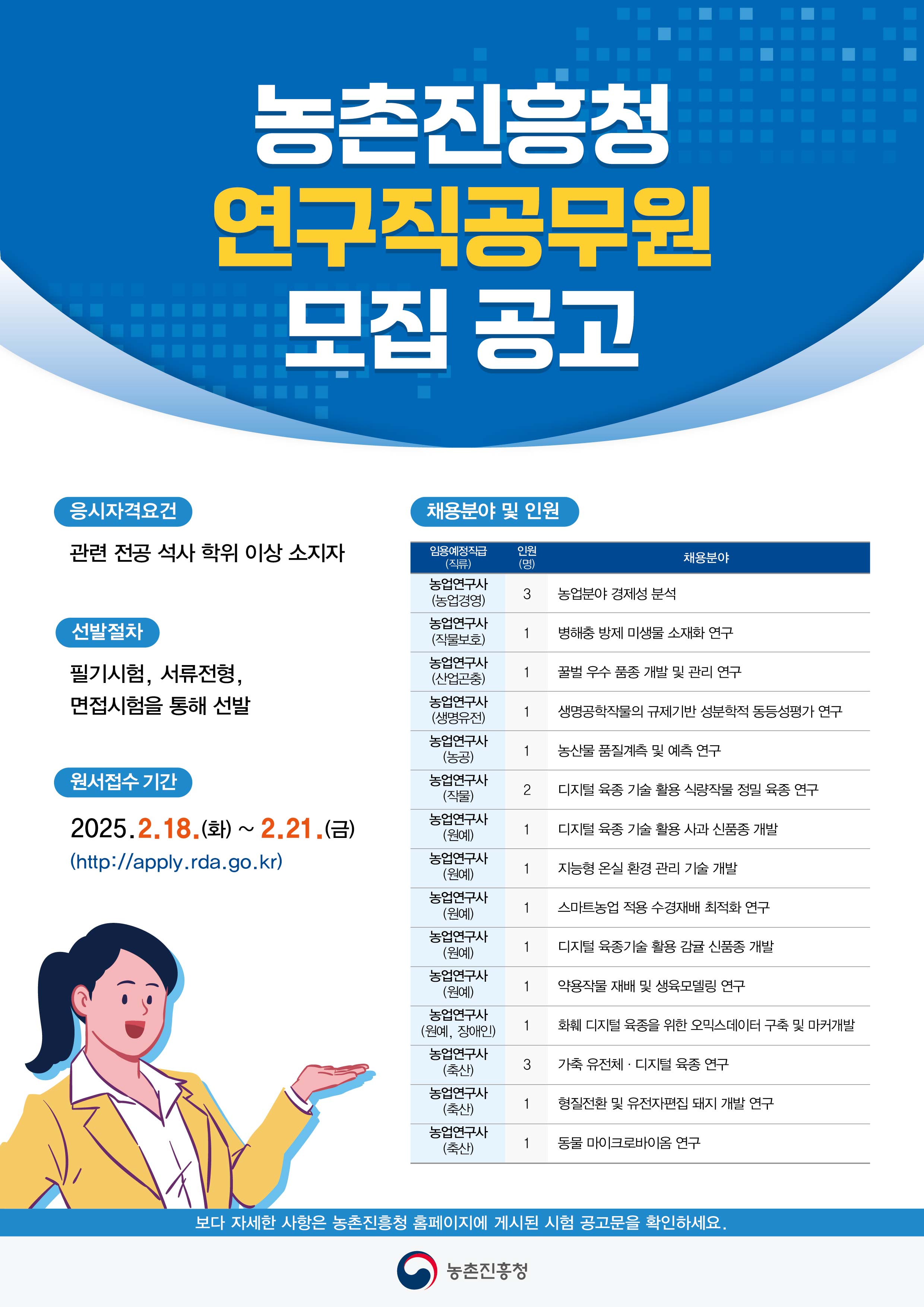 농촌진흥청에서 공무원임용시험령 제3조 및 제47조에 따라 우수 인재의 공직유치를 위한 국가공무원 경력경쟁채용시험을 아래와 같이 공고하여 시행하오니, 많은 응시 바랍니다.