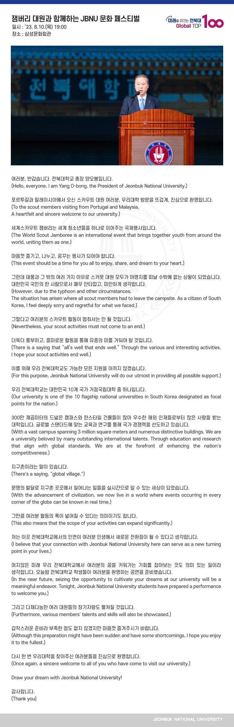 여러분, 반갑습니다. 전북대학교 총장 양오봉입니다. (Hello, everyone. I am Yang O-bong, the President of Jeonbuk National University.) 포르투갈과 말레이시아에서 오신 스카우트 대원 여러분, 우리대학 방문을 뜨겁게, 진심으로 환영합니다. (To the scout members visiting from Portugal and Malaysia, A heartfelt and sincere welcome to our university.) 세계스카우트 잼버리는 세계 청소년들을 하나로 이어주는 국제행사입니다. (The World Scout Jamboree is an international event that brings together youth from around the world, uniting them as one.) 마음껏 즐기고, 나누고, 꿈꾸는 행사가 되어야 합니다. (This event should be a time for you all to enjoy, share, and dream to your heart.) 그런데 태풍과 그 밖의 여러 가지 이유로 스카웃 대원 모두가 야영지를 떠날 수밖에 없는 상황이 되었습니다. 대한민국 국민의 한 사람으로서 매우 안타깝고, 미안하게 생각합니다. (However, due to the typhoon and other circumstances, The situation has arisen where all scout members had to leave the campsite. As a citizen of South Korea, I feel deeply sorry and regretful for what we faced.) 그렇다고 여러분의 스카우트 활동이 멈춰서는 안 될 것입니다. (Nevertheless, your scout activities must not come to an end.) 더욱더 풍부하고, 흥미로운 활동을 통해 유종의 미를 거둬야 할 것입니다. (There is a saying that “all’s well that ends well.” Through the various and interesting activities. I hope your scout activities end well.) 이를 위해 우리 전북대학교도 가능한 모든 지원을 아끼지 않겠습니다. (For this purpose, Jeonbuk National University will do our utmost in providing all possible support.) 우리 전북대학교는 대한민국 10개 국가 거점국립대학 중 하나입니다. (Our university is one of the 10 flagship national universities in South Korea designated as focal points for the nation.) 300만 제곱미터의 드넓은 캠퍼스와 한스타일 건물들이 많아 우수한 해외 인재들로부터 많은 사랑을 받는 대학입니다. 글로벌 스탠더드에 맞는 교육과 연구를 통해 국가 경쟁력을 선도하고 있습니다. (With a vast campus spanning 3 million square meters and numerous distinctive buildings, We are a university beloved by many outstanding international talents. Through education and research that align with global standards, We are at the forefront of enhancing the nations competitiveness.) 지구촌이라는 말이 있습니다. (Theres a saying, "global village.") 문명의 발달로 지구촌 곳곳에서 일어나는 일들을 실시간으로 알 수 있는 세상이 되었습니다. (With the advancement of civilization, we now live in a world where events occurring in every corner of the globe can be known in real time.) 그만큼 여러분 활동의 폭이 넓어질 수 있다는 의미이기도 합니다. (This also means that the scope of your activities can expand significantly.) 저는 이곳 전북대학교에서의 인연이 여러분 인생에서 새로운 전환점이 될 수 있다고 생각합니다. (I believe that your connection with Jeonbuk National University here can serve as a new turning point in your lives.) 머지않은 미래 우리 전북대학교에서 여러분의 꿈을 키워가는 기회를 잡아보는 것도 의미 있는 일이라 생각합니다. 오늘밤 전북대학교 학생들이 여러분을 환영하는 공연을 준비했습니다. (In the near future, seizing the opportunity to cultivate your dreams at our university will be a meaningful endeavor. Tonight, Jeonbuk National University students have prepared a performance to welcome you.) 그리고 다재다능한 여러 대원들의 장기자랑도 펼쳐질 것입니다. (Furthermore, various members talents and skills will also be showcased.) 갑작스러운 준비라 부족한 점도 없지 않겠지만 마음껏 즐겨주시기 바랍니다. (Although this preparation might have been sudden and have some shortcomings, I hope you enjoy it to the fullest.) 다시 한 번 우리대학을 찾아주신 여러분들을 진심으로 환영합니다. (Once again, a sincere welcome to all of you who have come to visit our university.) Draw your dream with Jeonbuk National University! 감사합니다. (Thank you)