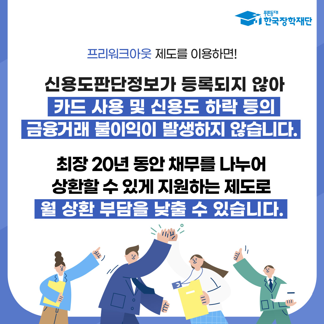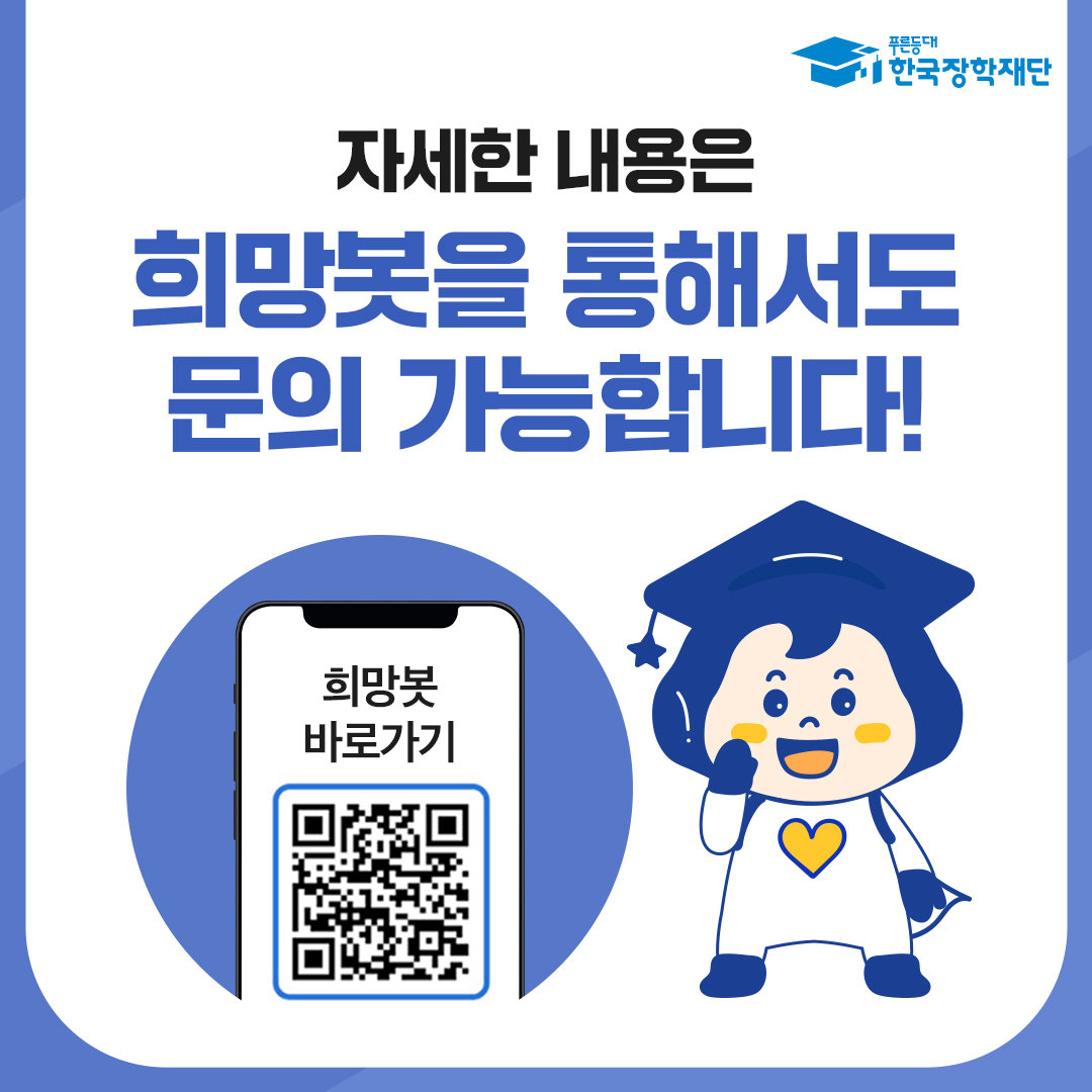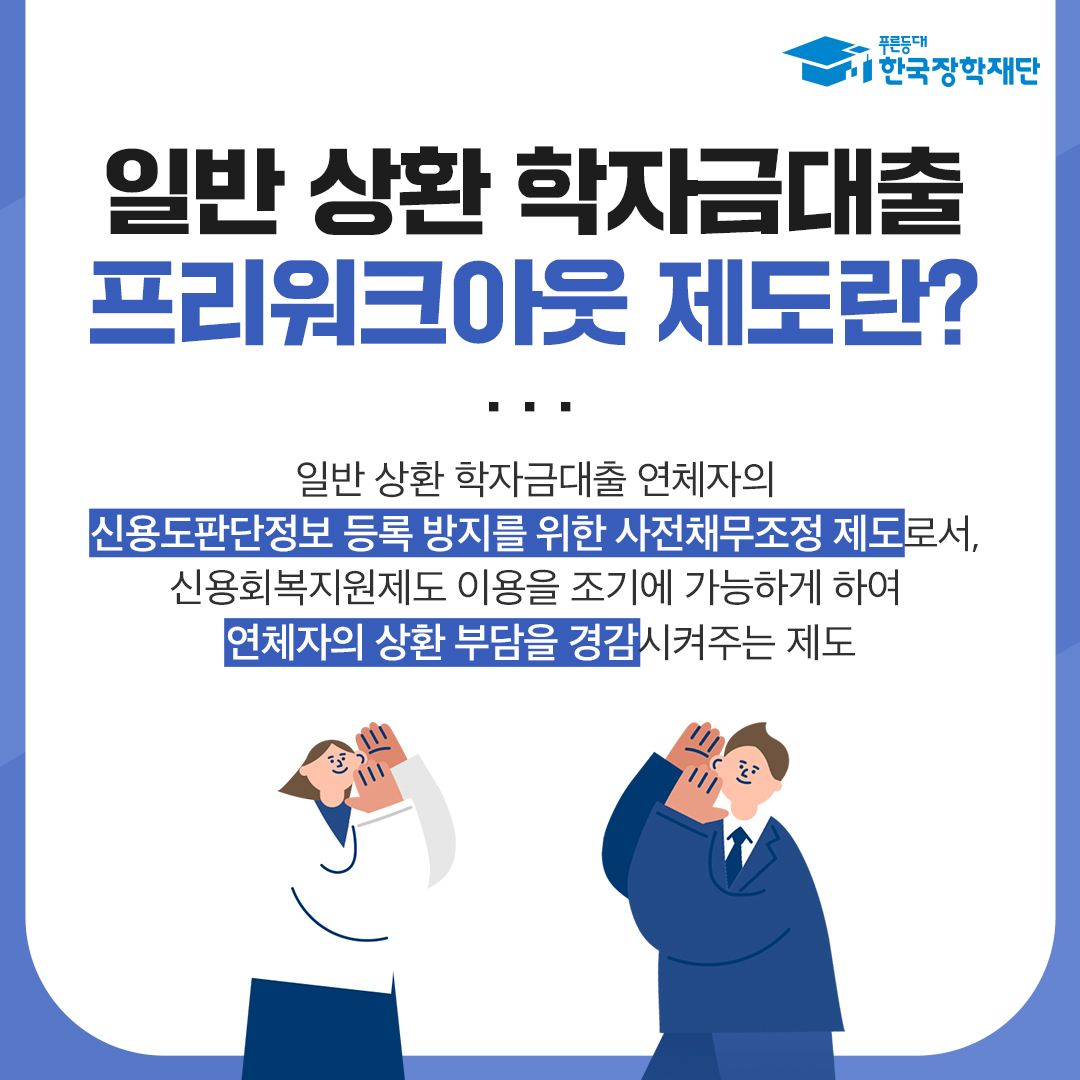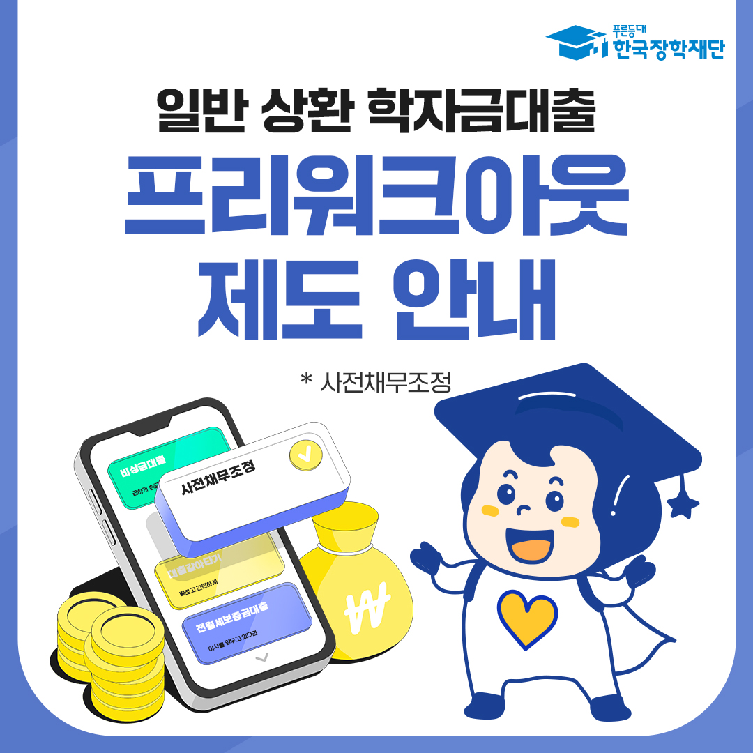 한국장학재단에서는 일반상환 학자금대출 이용 후, 경제적 곤란 사유가 발생한 대학(원)생 상환부담 완화를 위해 「특별상환유예대출」 및 「프리워크아웃」 제도를 운영한다고 하오니, 관심 있는 학생들의 신청 바랍니다.