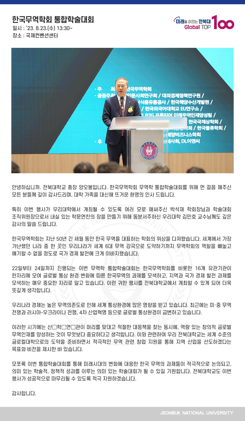 안녕하십니까. 전북대학교 총장 양오봉입니다. 한국무역학회 무역학 통합학술대회를 위해 먼 걸음 해주신 모든 분들께 깊이 감사드리며, 대학 가족을 대신해 뜨거운 환영의 인사 드립니다.