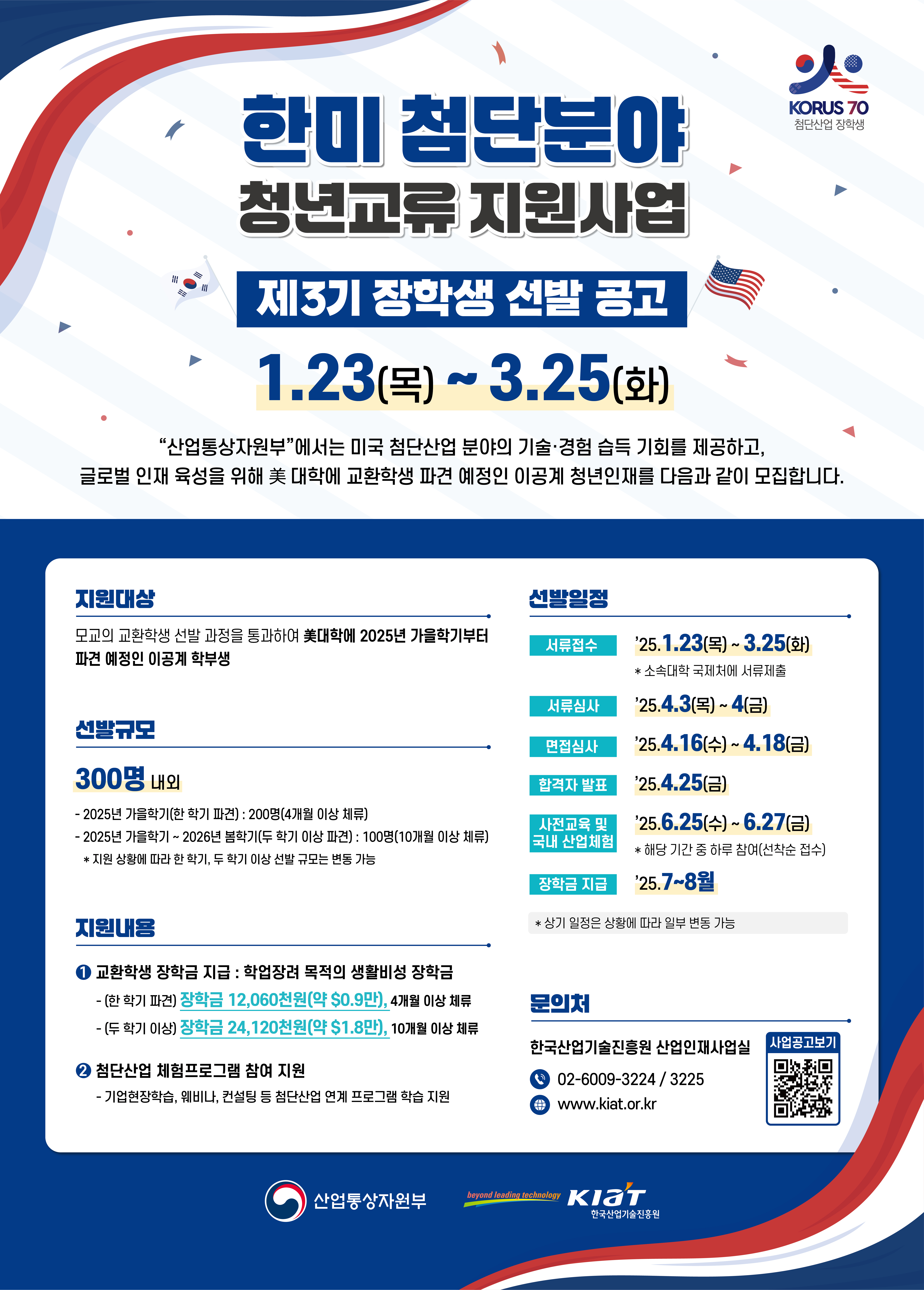 산업통상자원부 사업의 일환으로 글로벌 인재 육성을 위한 ‘한미 첨단분야 청년교류 지원사업’ 장학생을 선발 공지입니다.